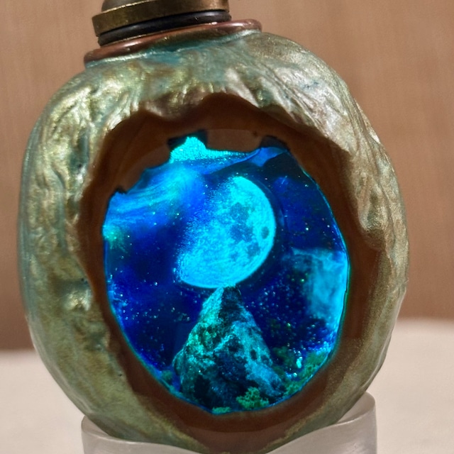 クルミのLEDランタン。 月と岩山のイメージです。胡桃の内壁を宇宙っぽく仕上げました。クルミの殻はパールパウダーで薄く彩色しています。 窓の加工を少し変えました。以前は大まかにドリルで穴を開けていたのですが、たまに割れるので削って平面に加工する手順に変えました。 ついでに背面も平らにしています。たまに首から下げたいとのたまうお客さんがいるのと、お月様を据えるのに都合が良いのです。 デフォルトで付くストラップはアズキチェーン金古美です。 頭のてっぺんを右に回すと点灯します。左に回すと消灯し、さらに回すとてっぺんが外れて電池の交換ができます。電池交換の説明書を用意しました。ちなみにLEDの点灯パターンは4色の繰り返しです。 点滅の様子。 https://www.instagram.com/reel/DVGR4QjEdga/?igsh=NjA0czJ0MWJzcnlk 価格5500円 送料180円