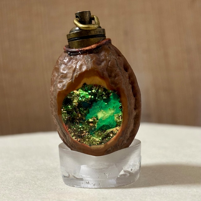 クルミのLEDランタン。(旧式) 水の中の黄鉄鉱(パイライト)の洞窟のイメージ。殻の内壁の一部は宇宙っぽい仕上げにしてみました。ブラックライトで天の川みたいになります。 旧式の削り方の殻の在庫が無くなったらこのシリーズは終了です。 黄鉄鉱を使ったLEDランタンは原石の素材を見せたいので、ホワイトかウォームホワイトで作ることが多かったんですが、これは珍しく4色LEDです。 頭のてっぺんを右に回すと点灯します。左に回すと消灯し、さらに回すとてっぺんが外れて電池の交換ができます。電池交換の説明書を用意しました。LED色はウォームホワイト。 デフォルトで付いているストラップはアズキチェーン金古美です。ペンダントにしたいなど備考欄からご相談ください。 点灯の様子。 https://www.instagram.com/reel/DVLI1eJkUmh/?igsh=eDRscjY3bzE0a21y 旧作価格です。 価格3500円 送料180円