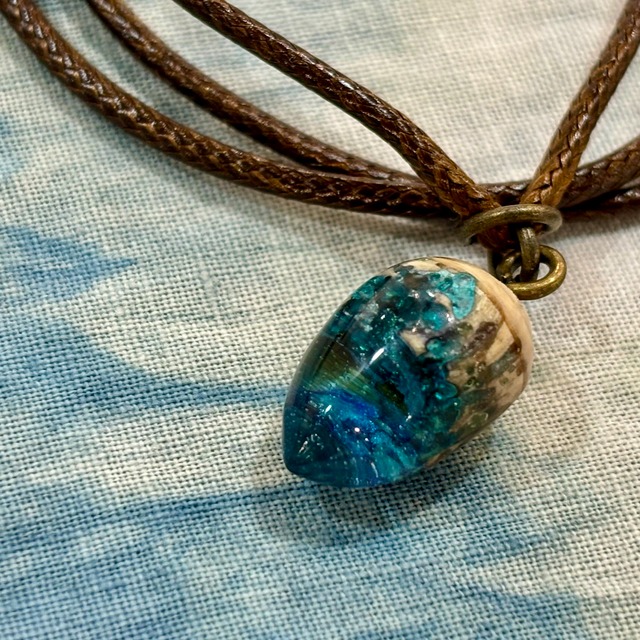 ヒノキの虫喰い流木を使っています。 薄い青のレジンの色に合わせてソーダライトをあしらいました。ちょっと宇宙から見た地球に似ている青い石です。 激しく虫に喰われたこの流木を使うとレジンの中の気泡を完全に殲滅するのがとても難しいので、このシリーズでは積極的に気泡は残しています。 コードはマクラメコードを編んでいます。長さは調節可能で最大長は65㎝強。 価格 3500円 送料 140円(定形外予定)