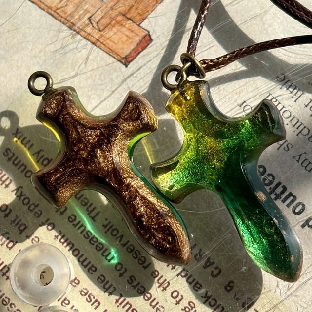 流体金属のクロス。 クロスの半分は真鍮の粉を練り込んだレジンです。 固まる前に軽くかき混ぜて金属の流紋をつけています。 もう半分は薄い黄色と緑です 元々のデザインは古代の磨製石剣です。鍔の部分を伸ばして十字の形に寄せました。 紐はワックスコード焦茶色。長さは約70センチメートル弱で短く調節できます。 価格2500円 送料180円