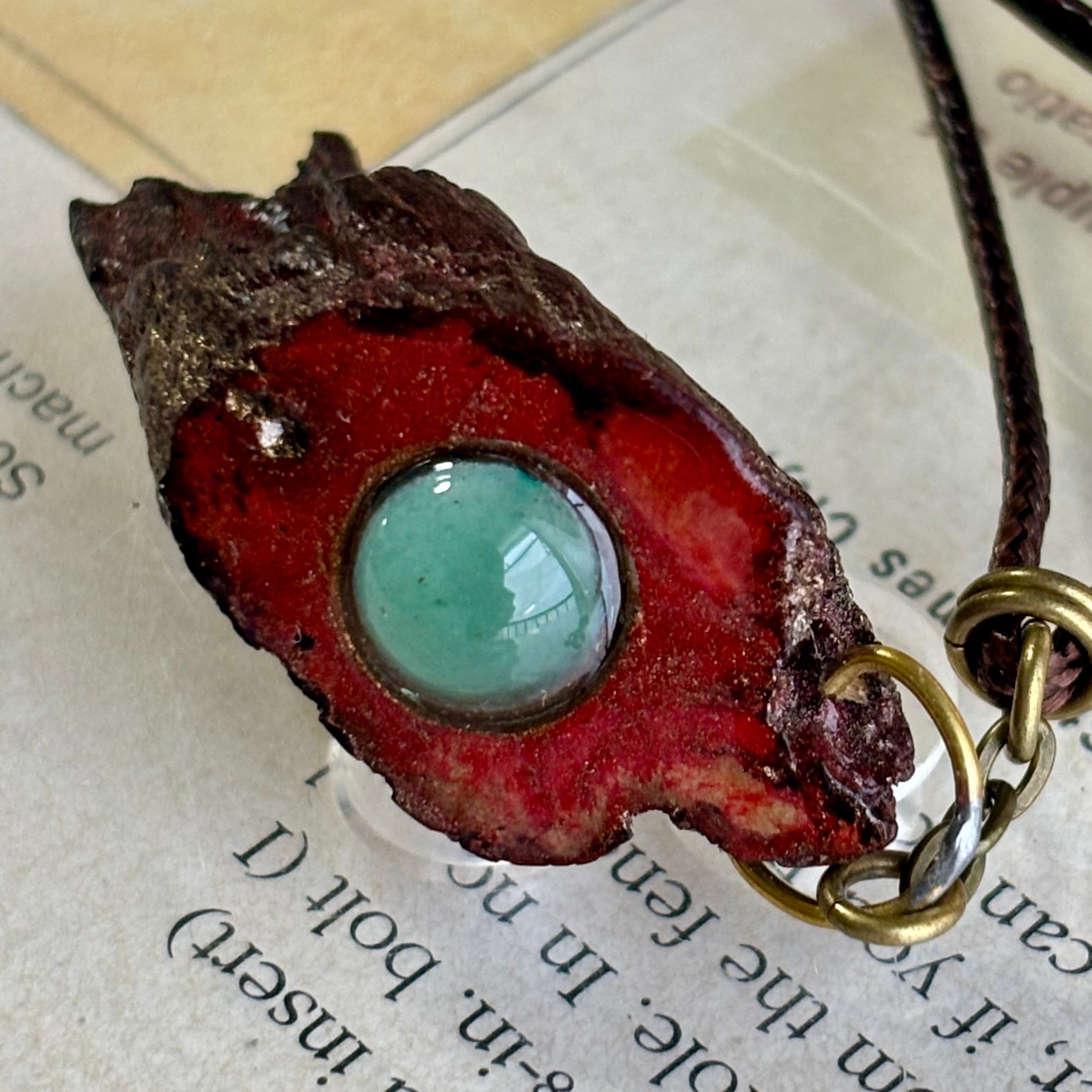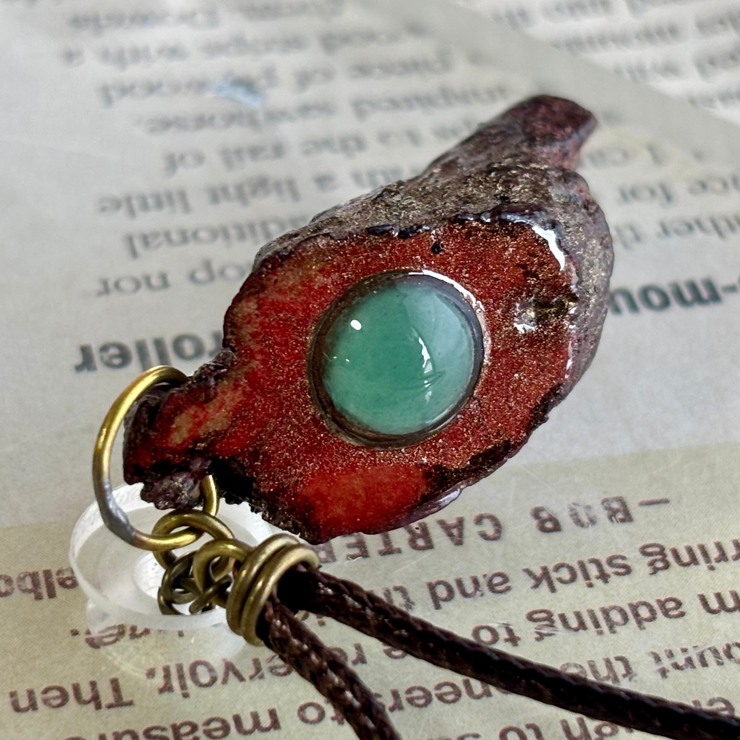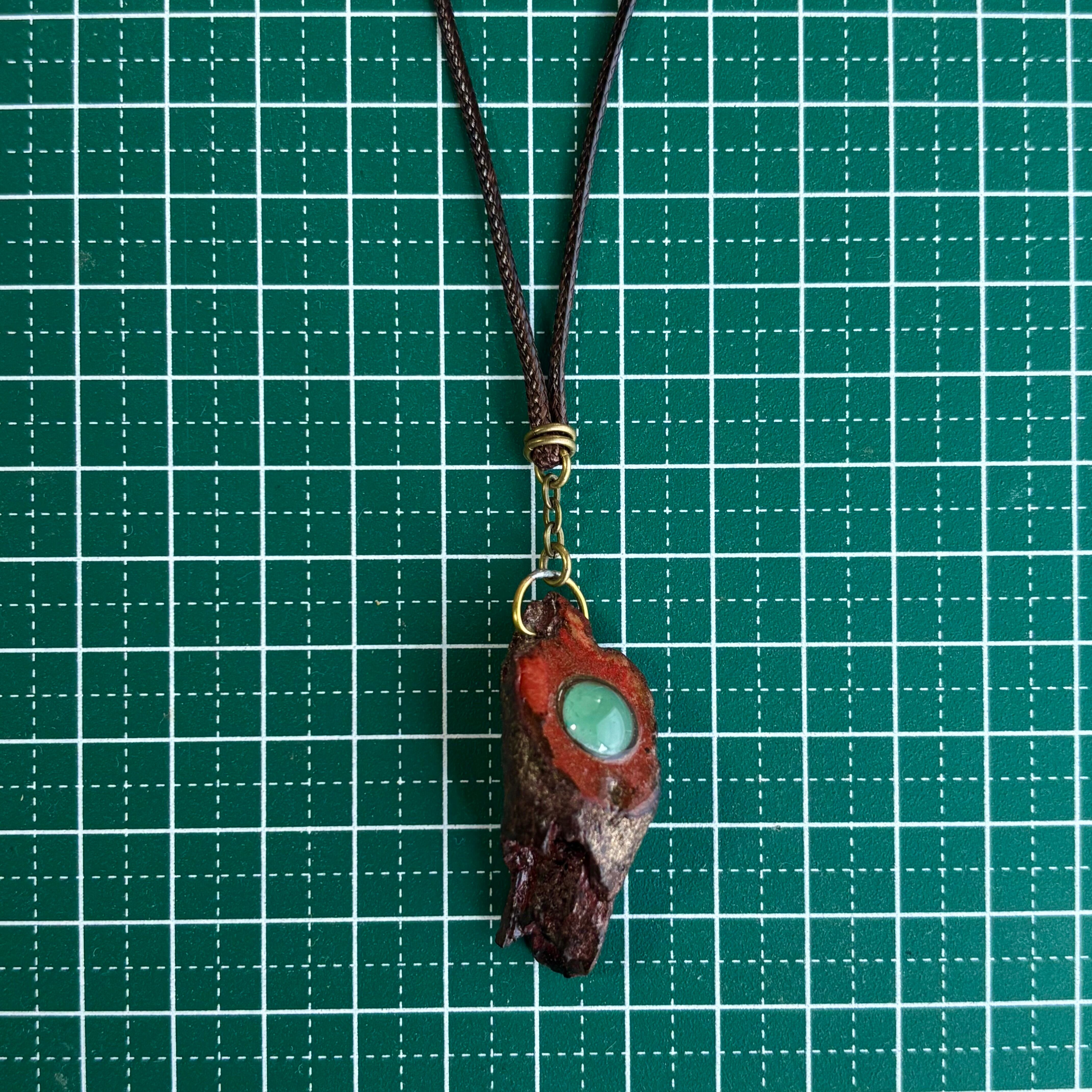小ぶりの流木に生漆、朱漆、黒漆、代用金粉などを塗り重ねて呪いのアイテムのようにしたものです。始めは流木のみだったのですが、お客さんから犬のうんこのようだと指摘を受けたので天然石を嵌め込んだりと少し手を入れました。