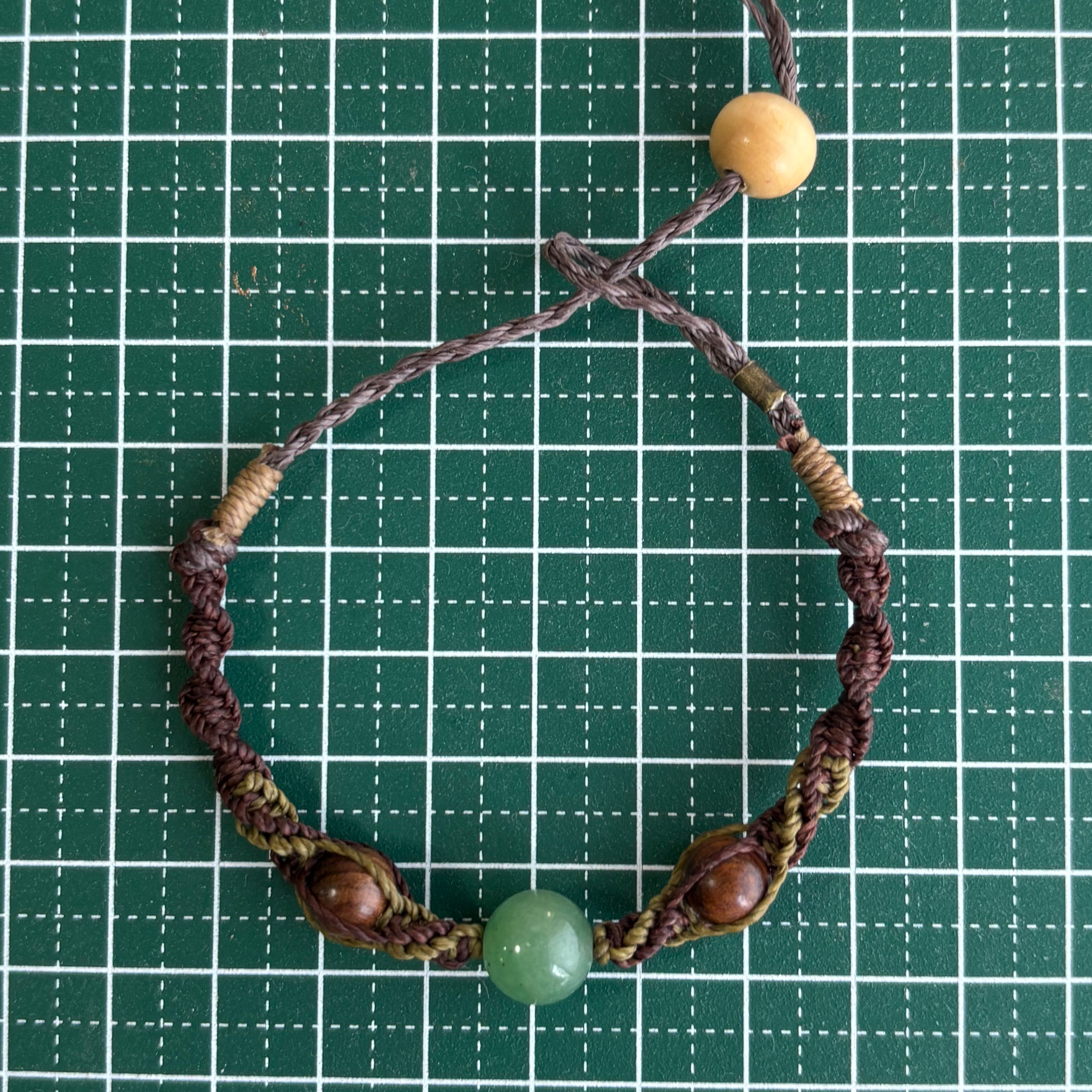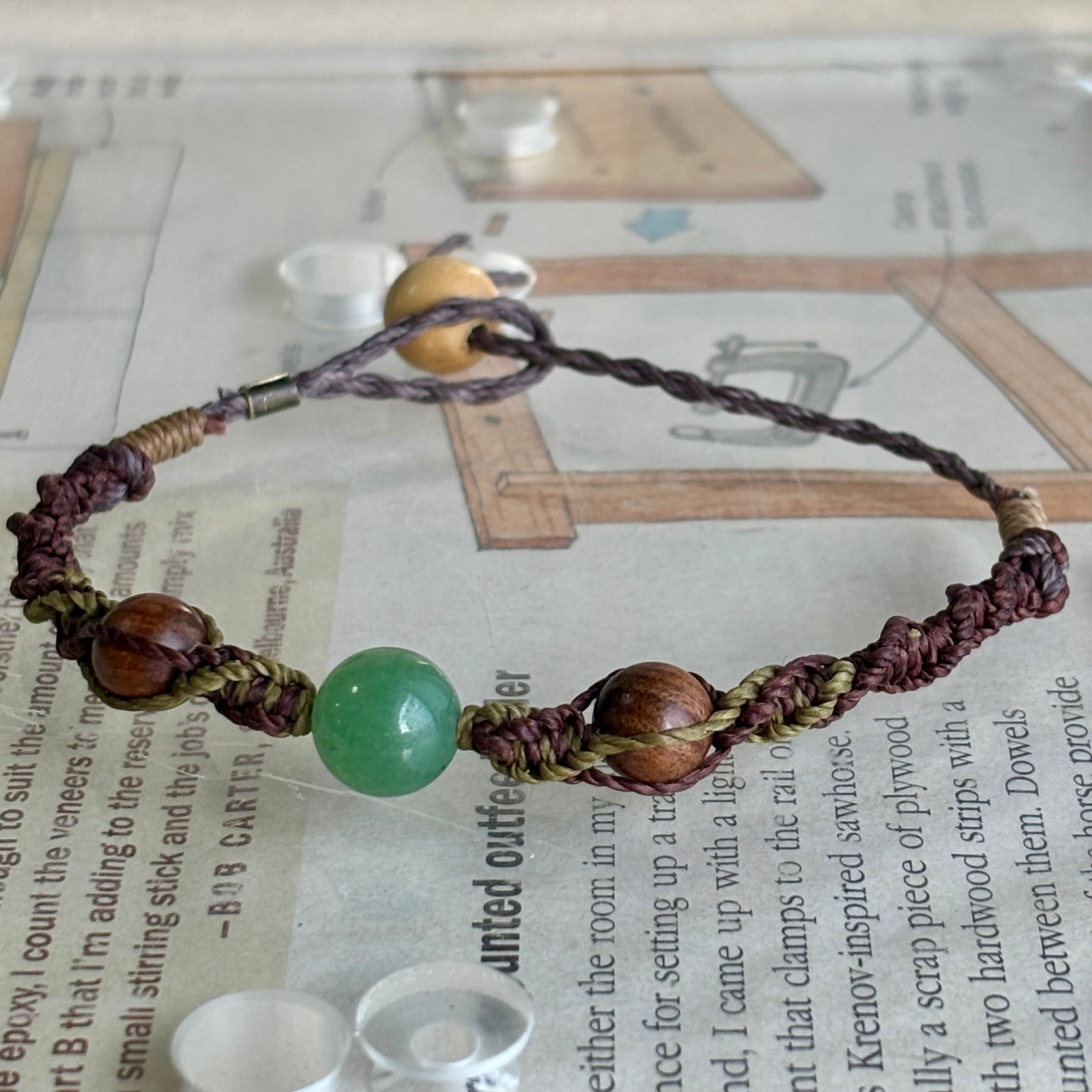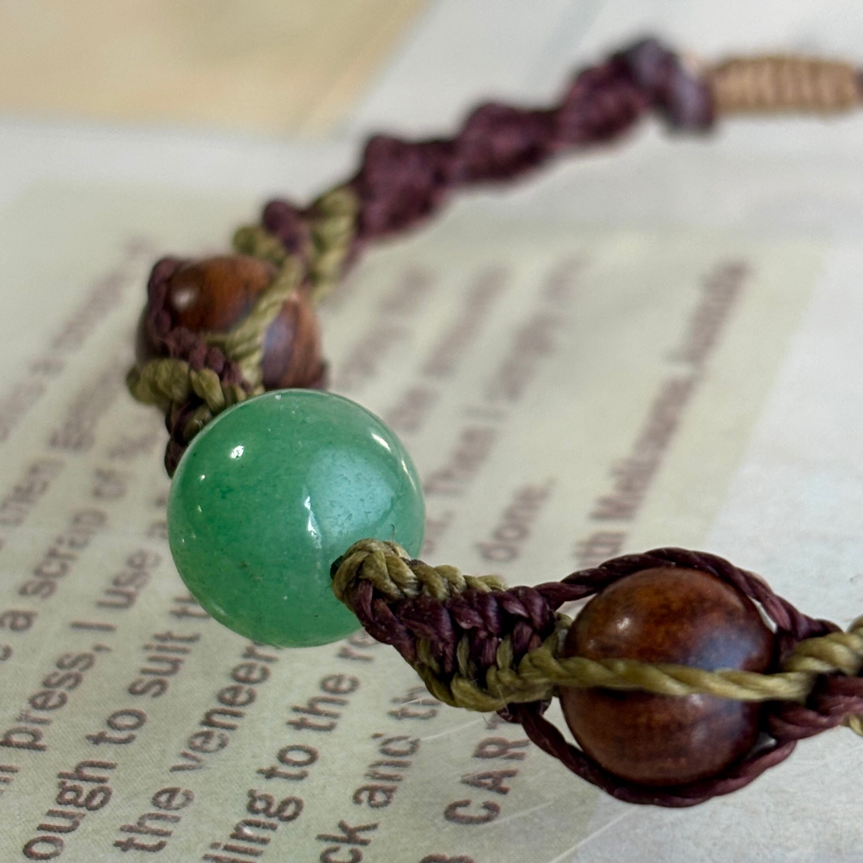 あいだに編み込んである玉はアベンチュリンと木球です。