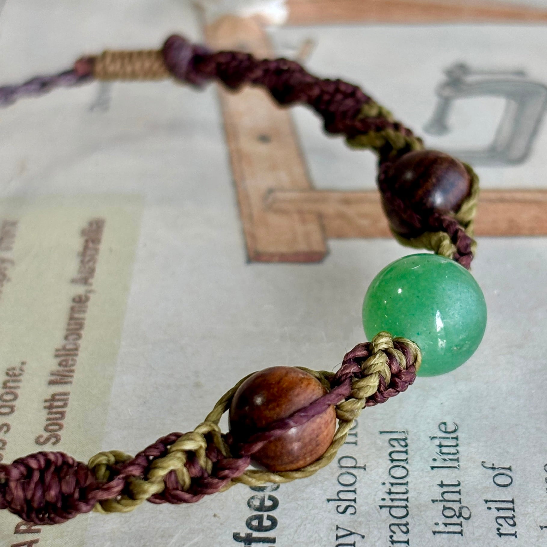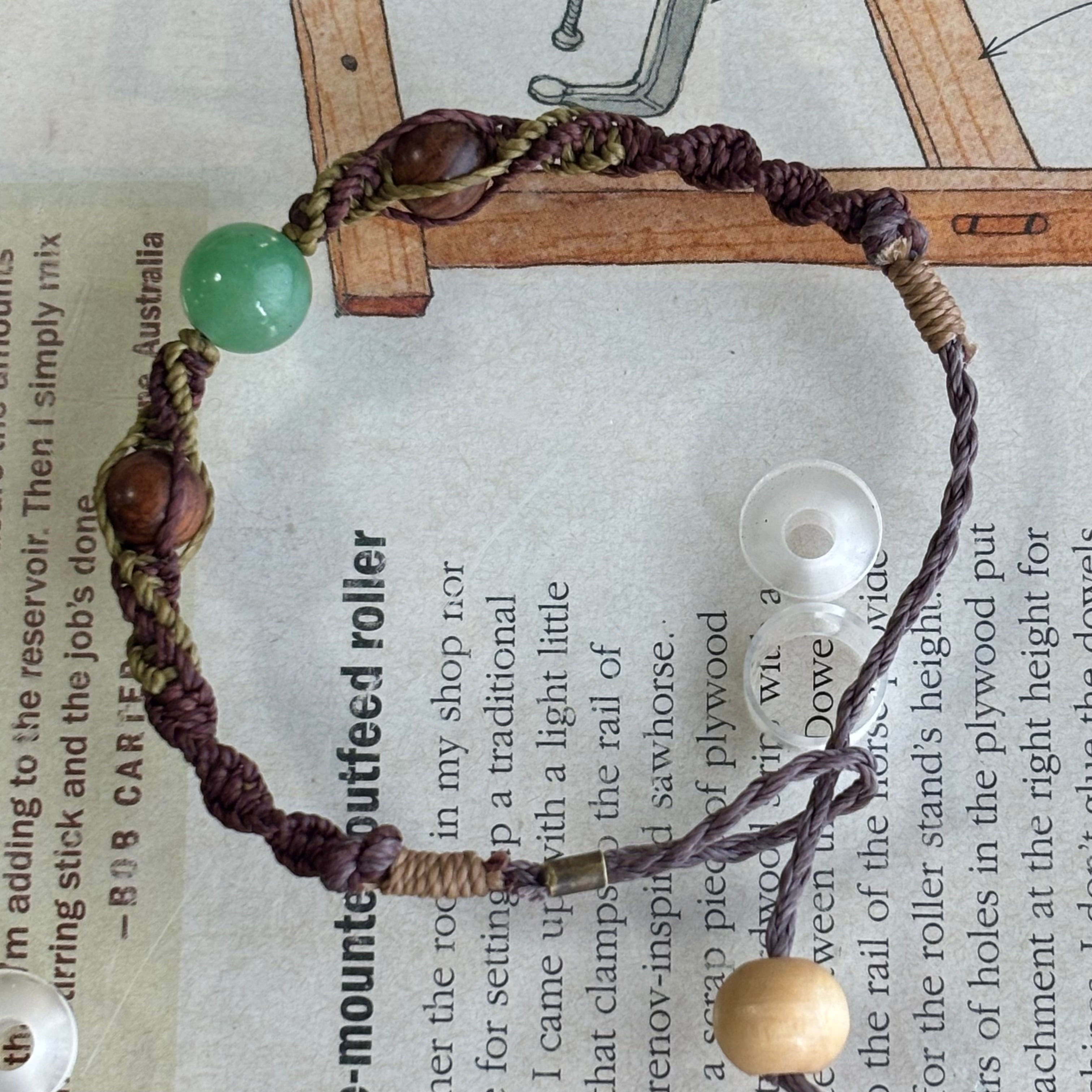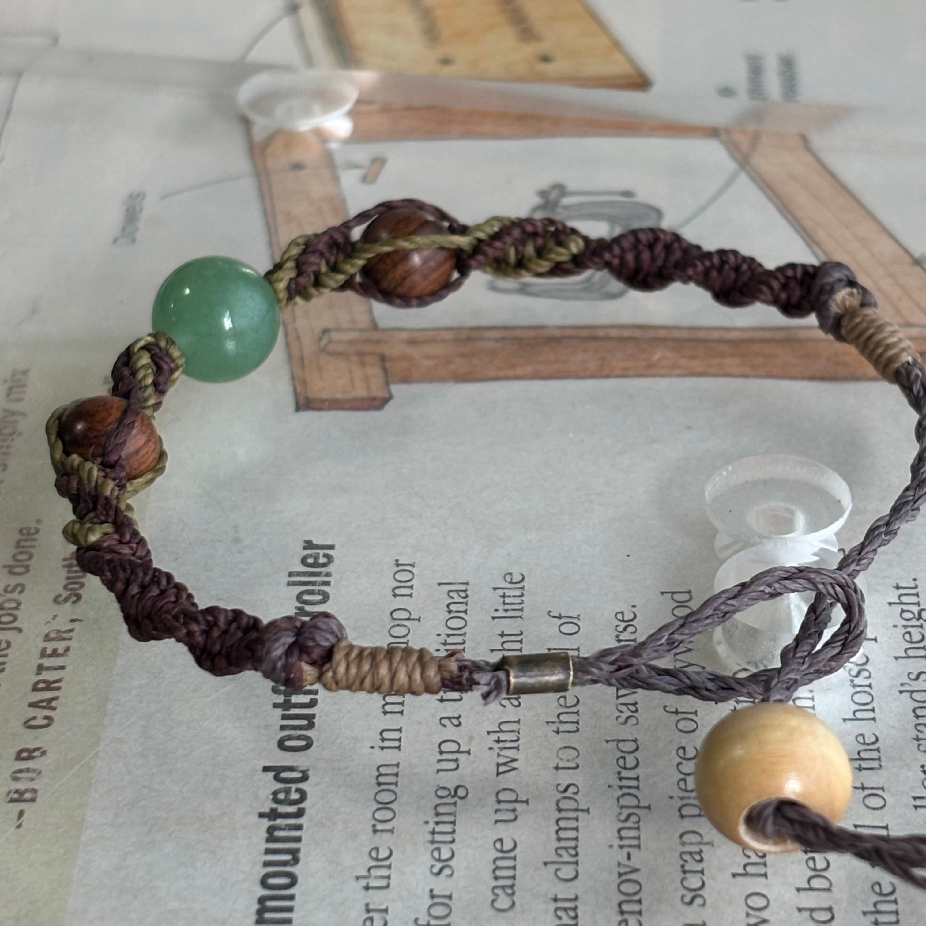 あいだに編み込んである玉はアベンチュリンと木球です。
