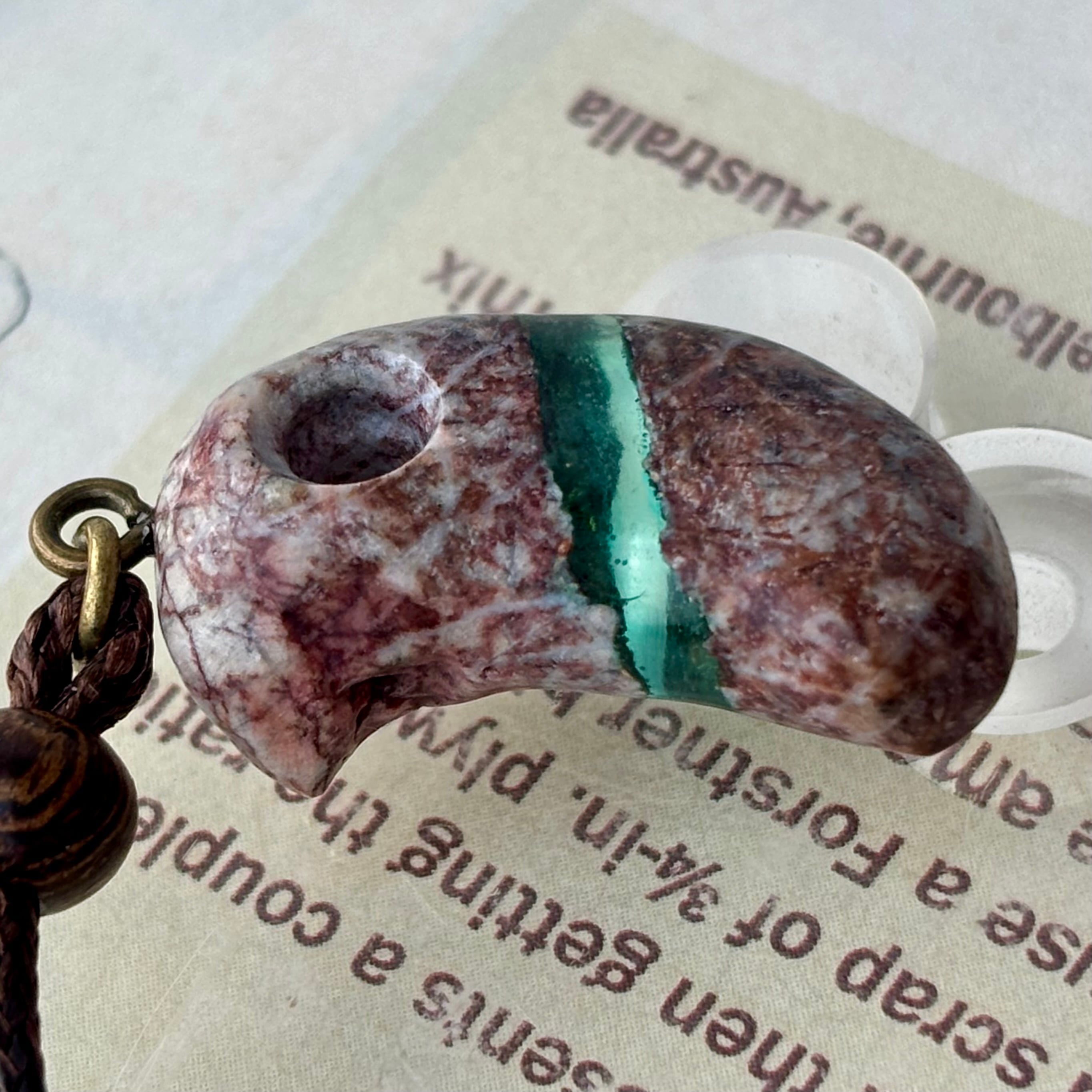 はじめに勾玉っぽくしようと思ったんですけど、原石のままの部分をどこか残そうと思い直したんですね。紐を通す穴を開けたんですが、なんとなく鳥とかミジンコに見えたので、紐を通すのはやめて、頭の上にヒートンを付けました。