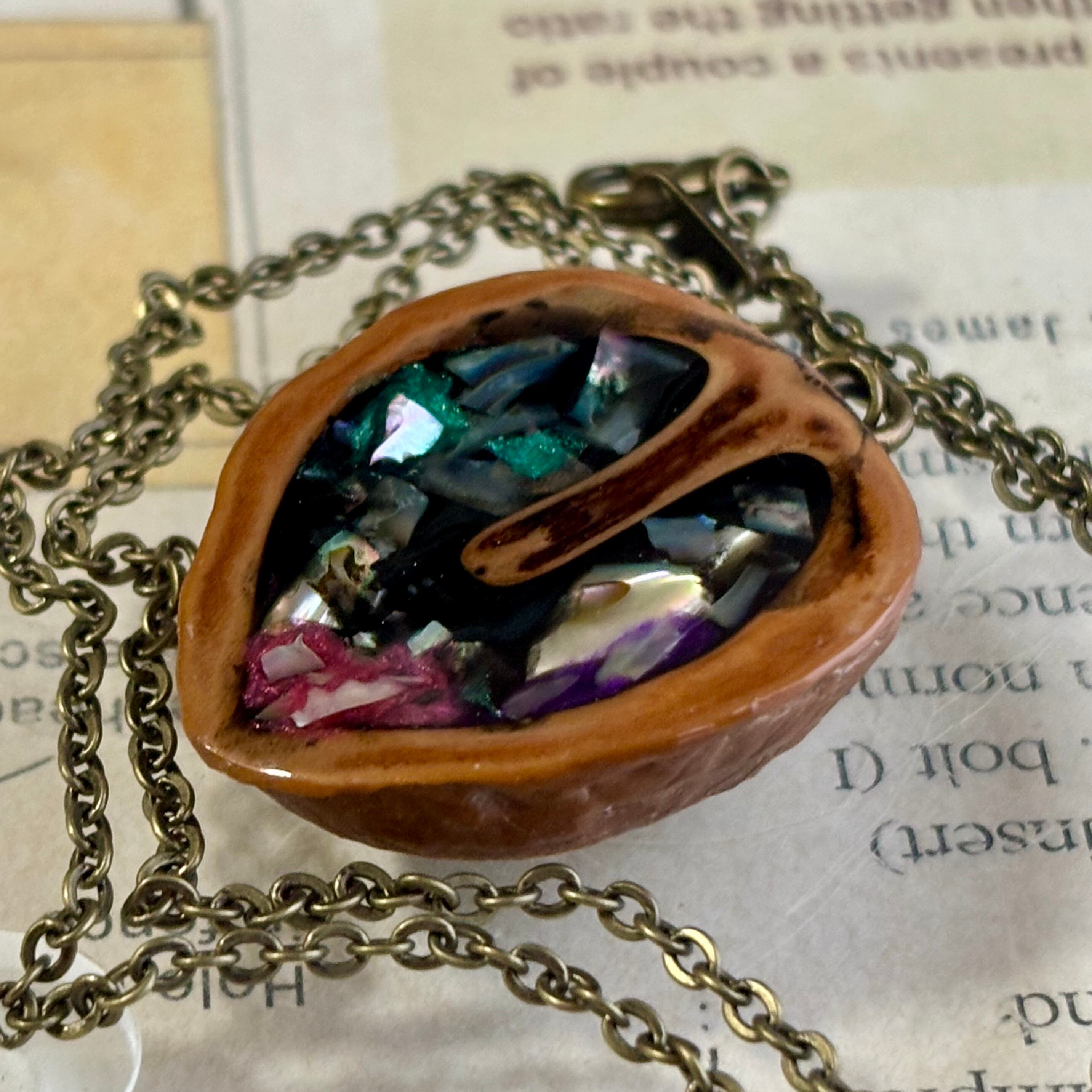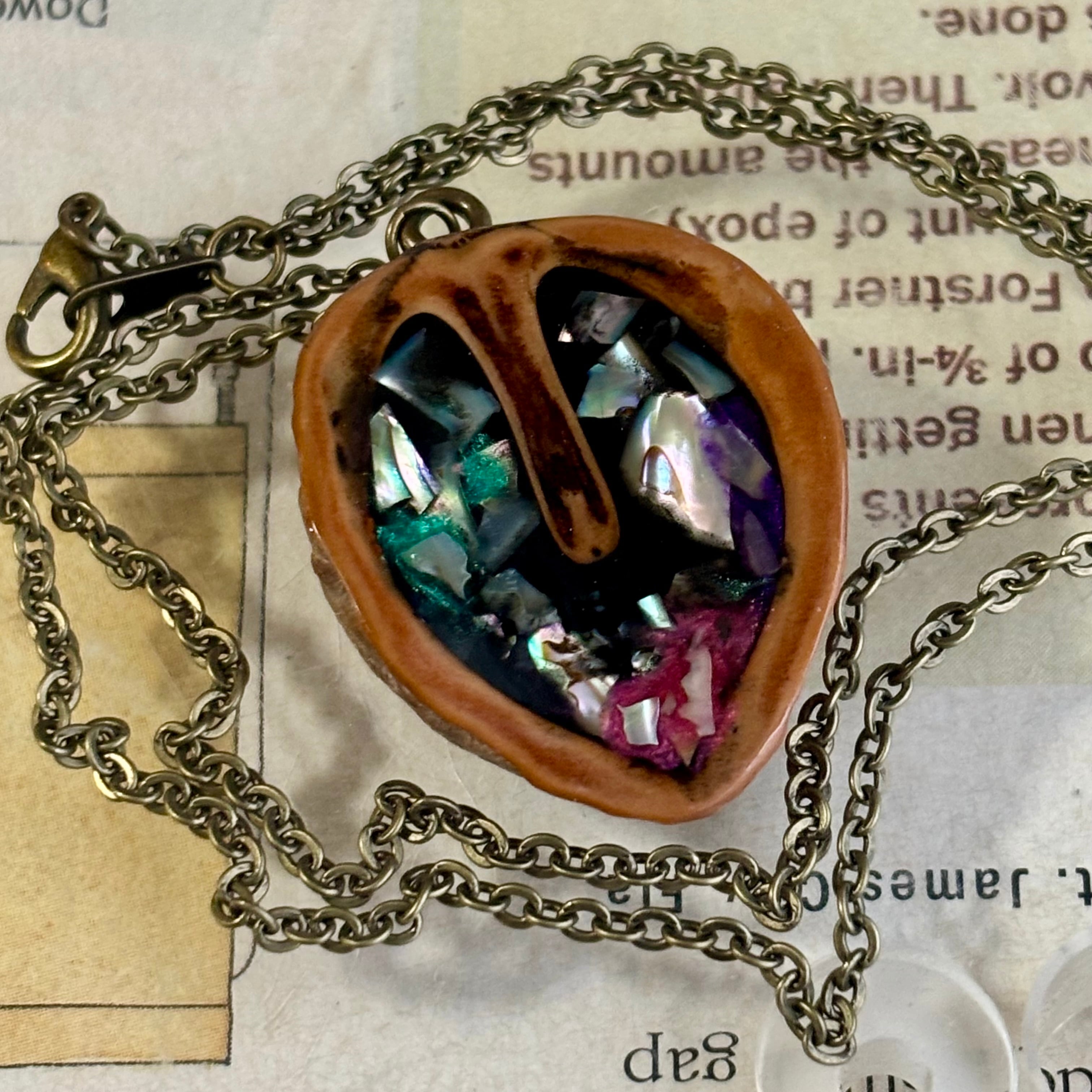 ピーマンの肉詰めみたいに砕いたアワビ貝をクルミの殻に詰めました。