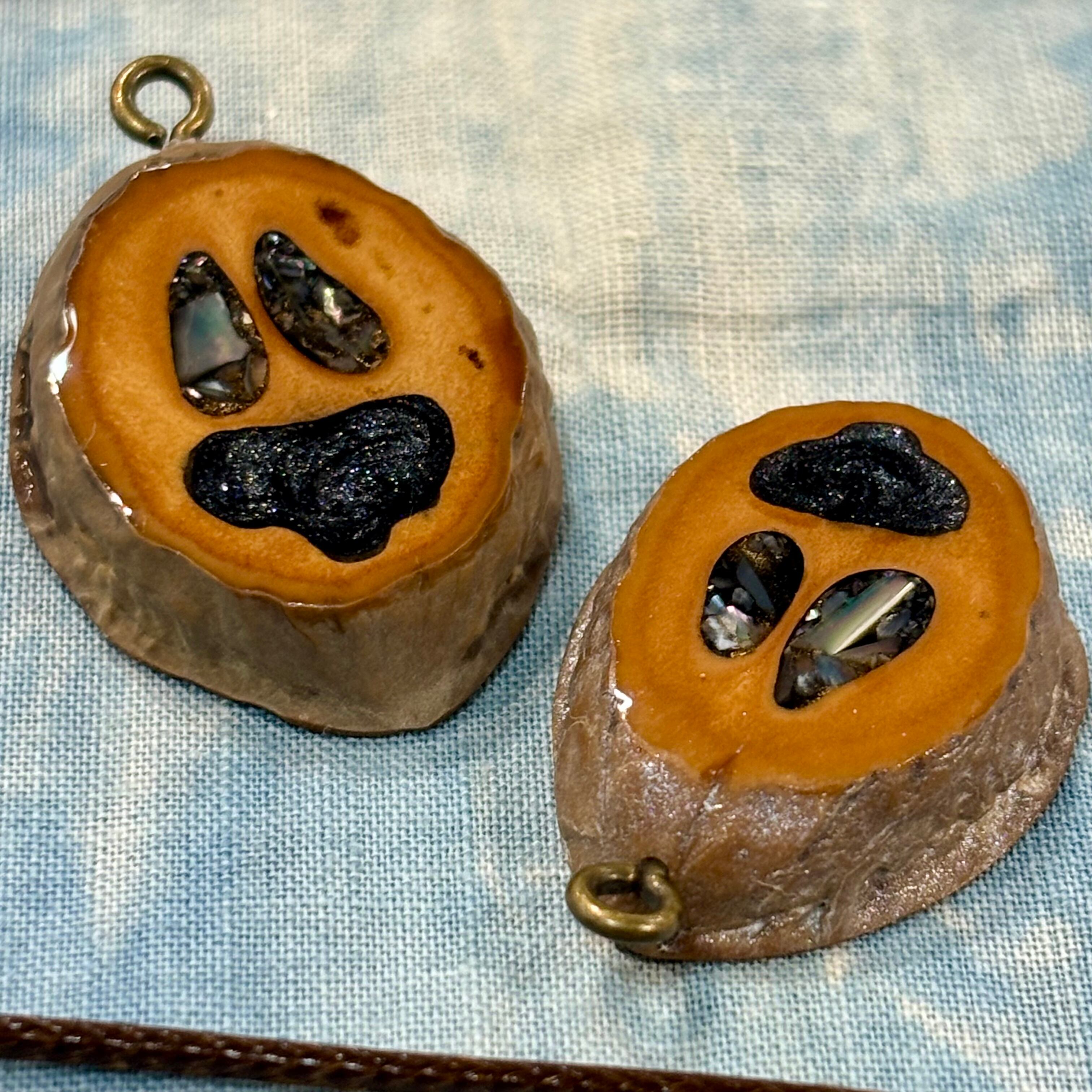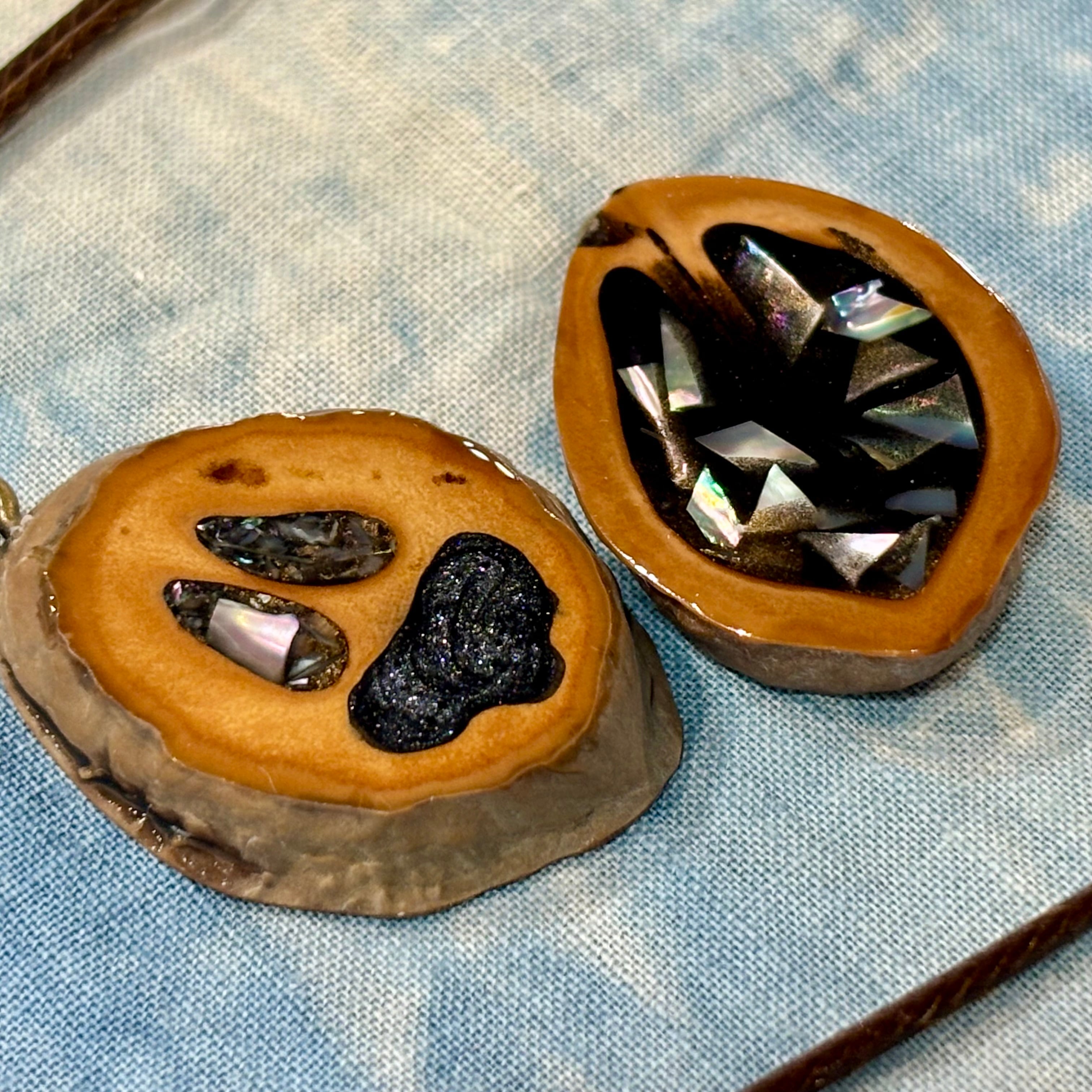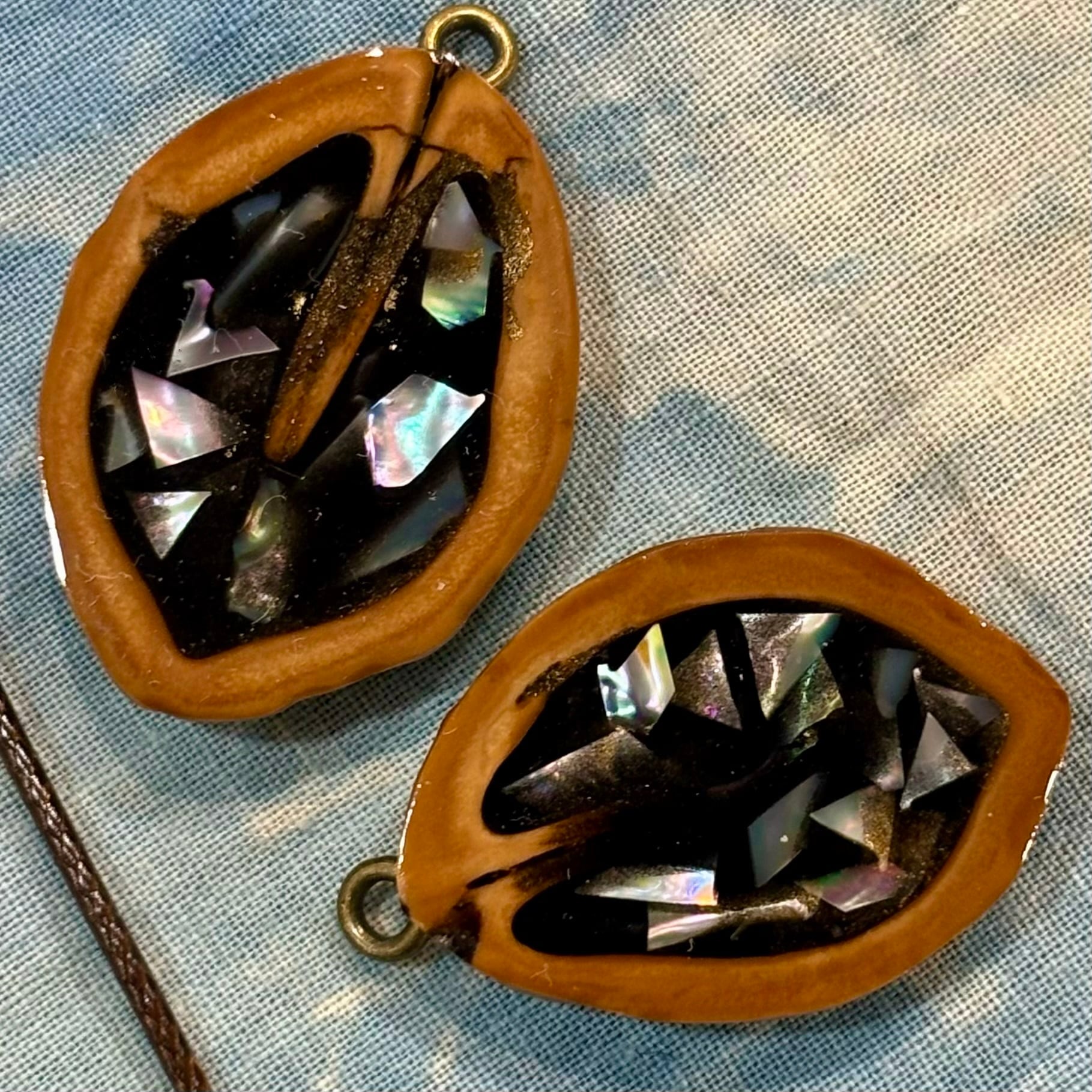 ピーマンの肉詰めみたいに砕いたアワビ貝をクルミの殻に詰めました。隙間に充填したのはパールパウダーを練り込んだレジンです。