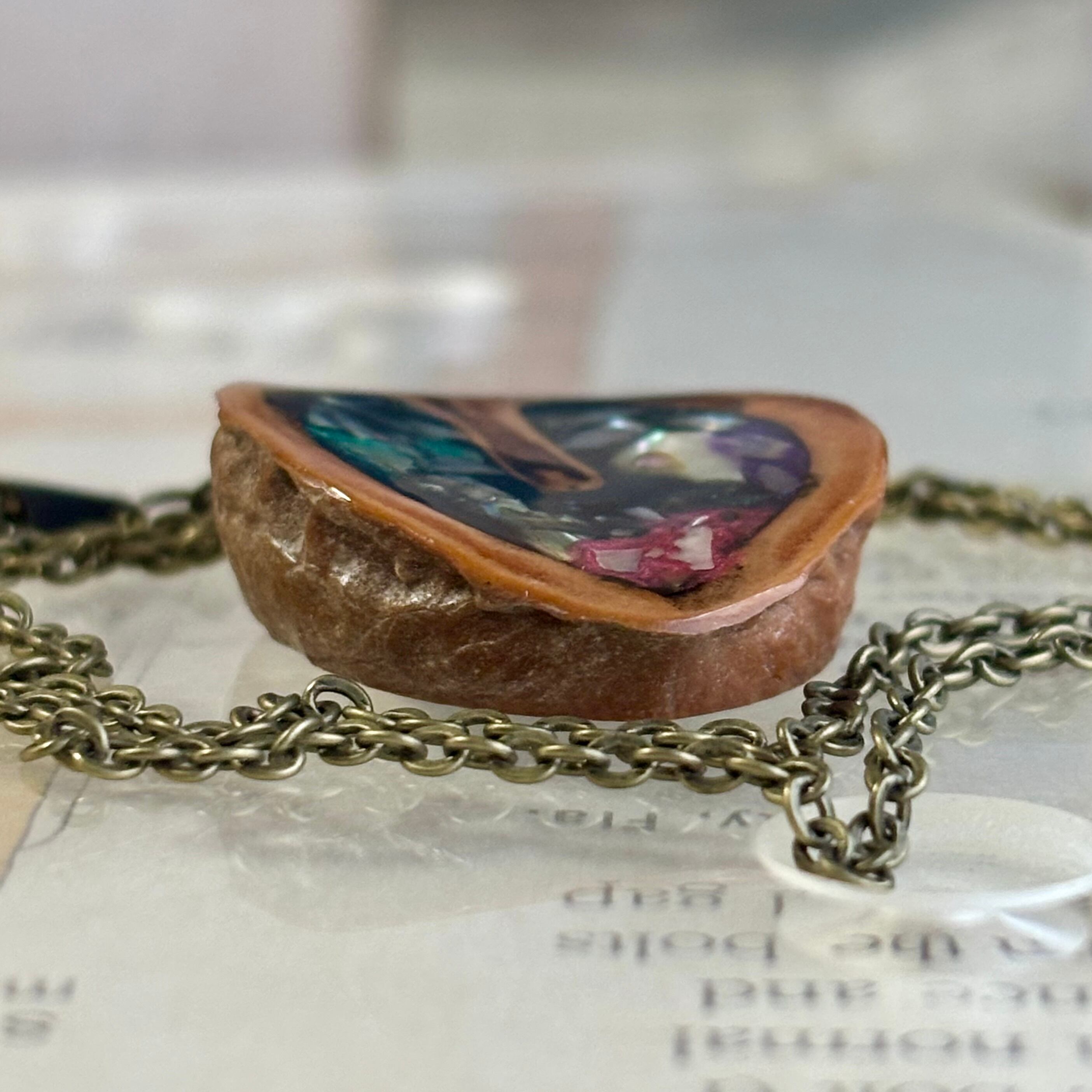 隙間に充填したのはパールパウダーを練り込んだ何色かのレジンです。ややサイケデリックに色調を整えています。最後に表面を砥石で研ぎ上げました。