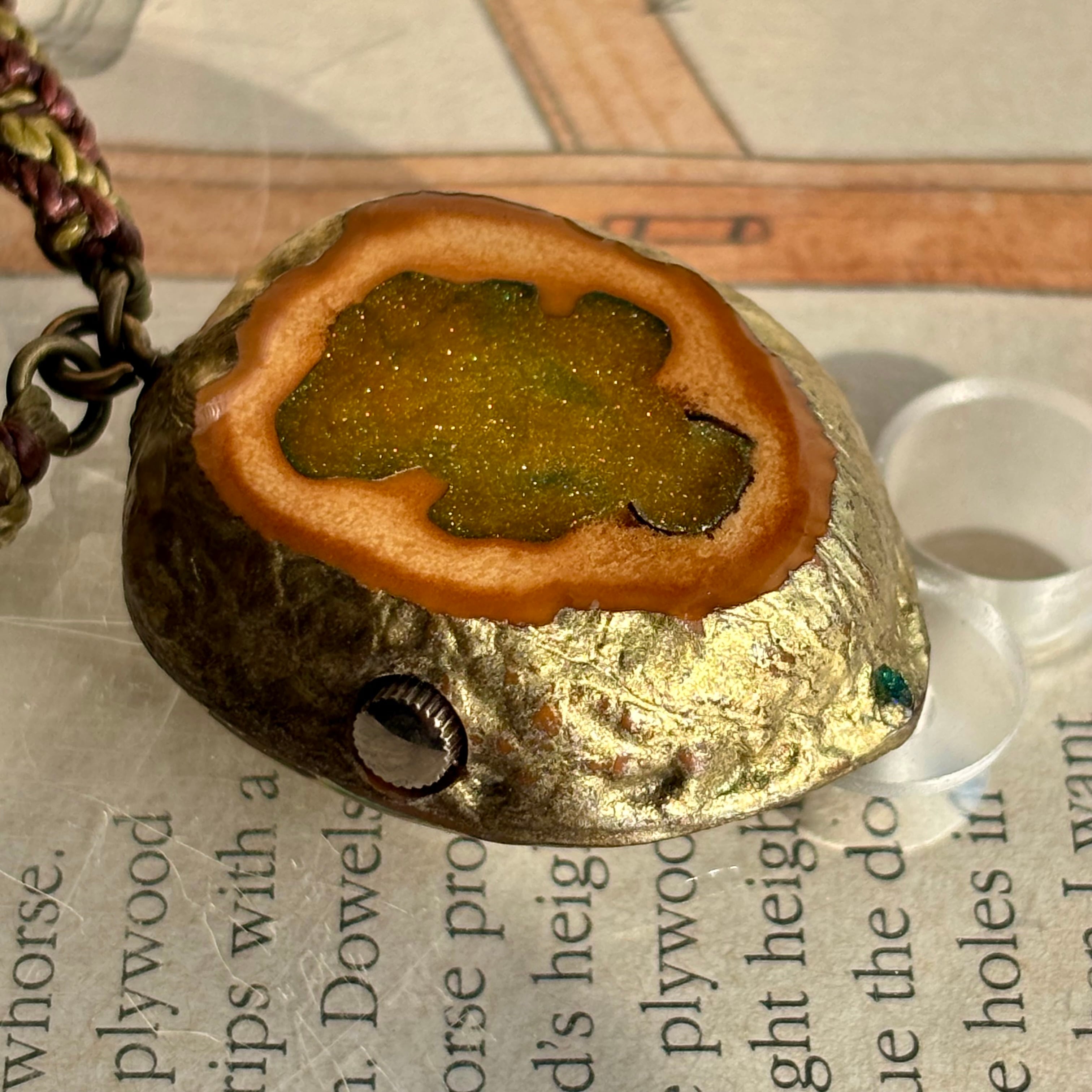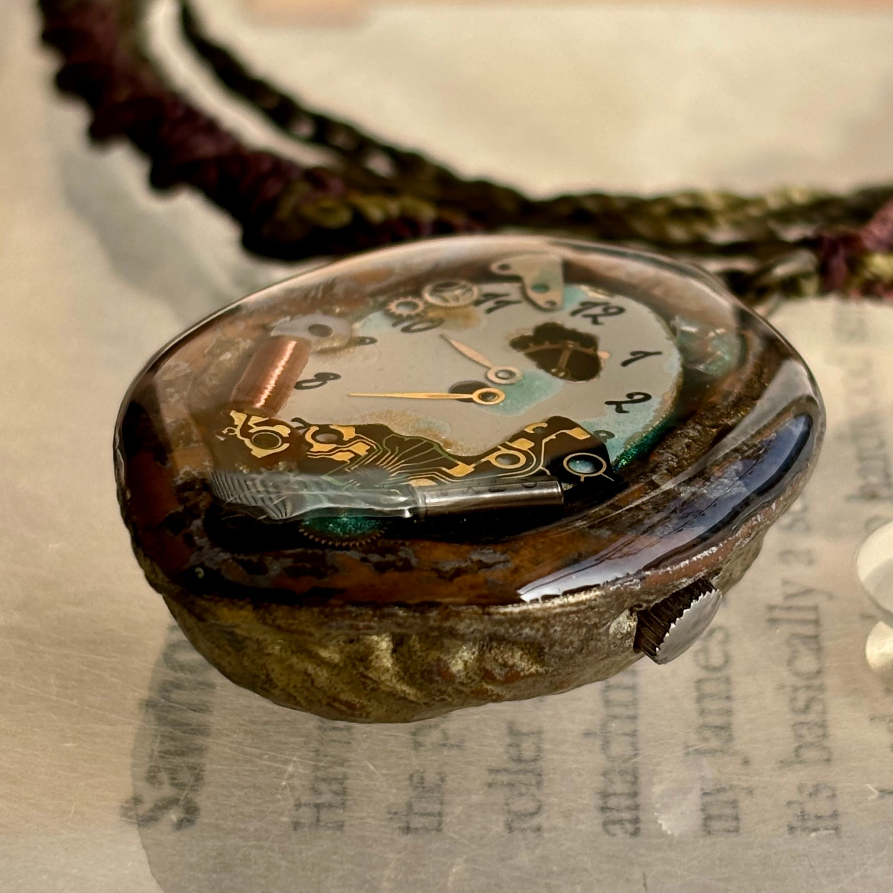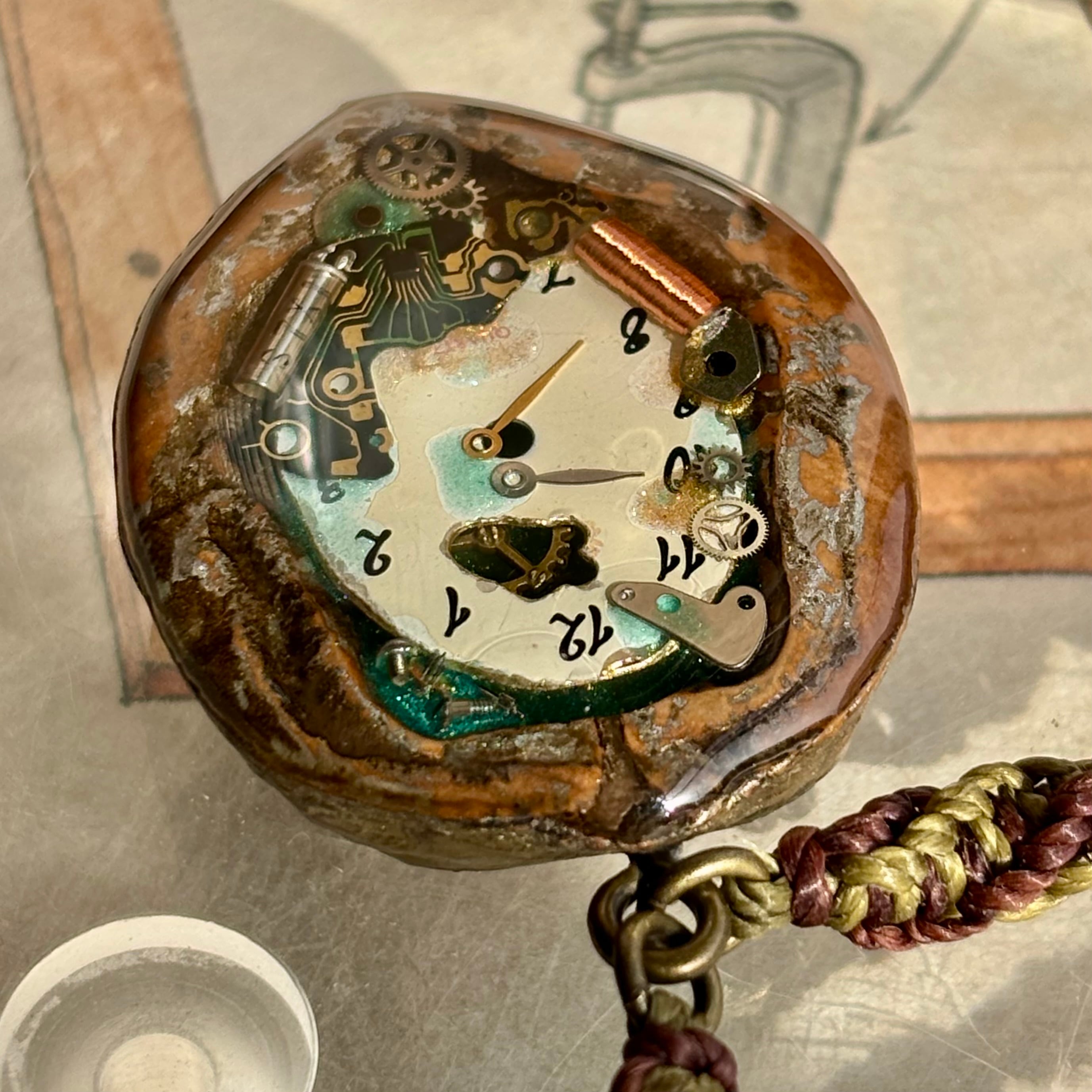 ジャンク品の腕時計をばらしてクルミの殻の中に封入しています。側面塗装はマッドゴールド。リューズを埋め込みました。所々パールパウダーで緑青(銅や真鍮のサビ)っぽく見せています。