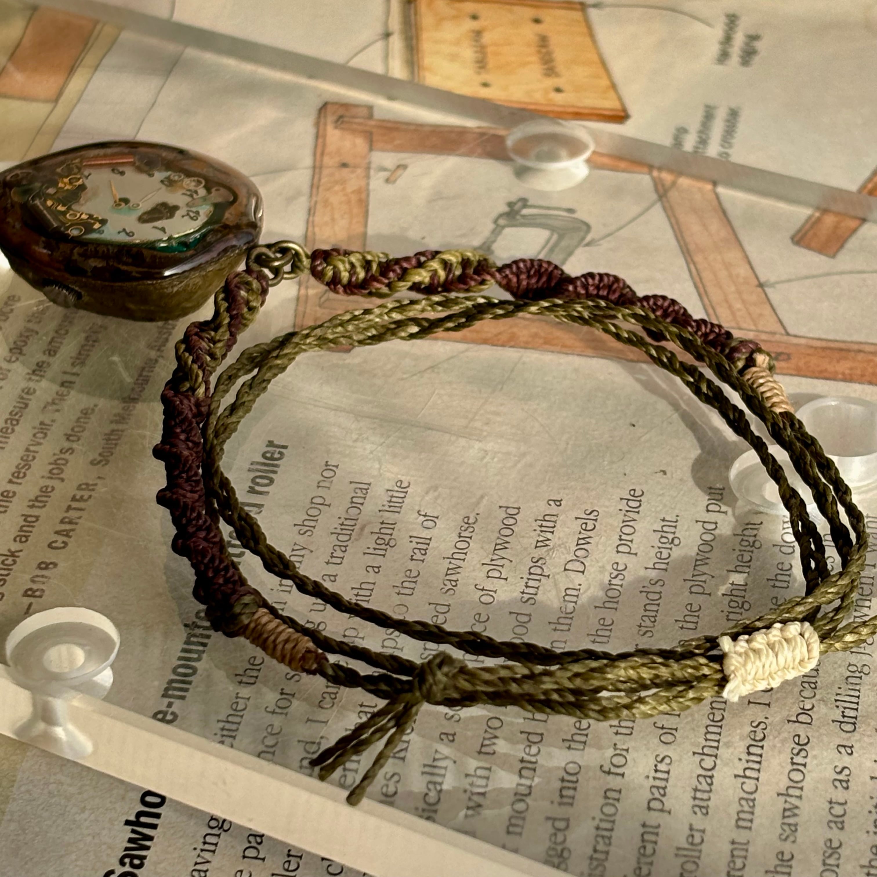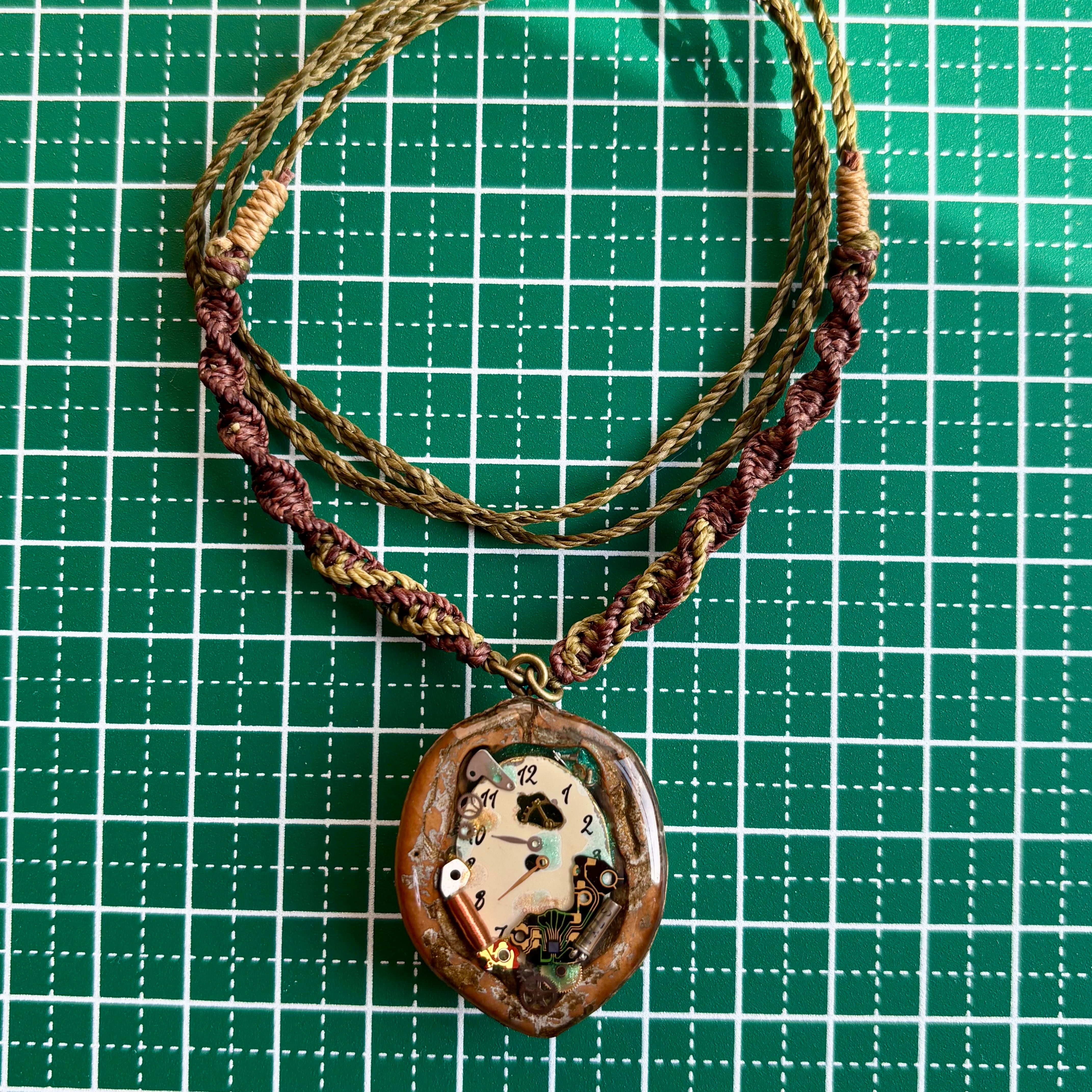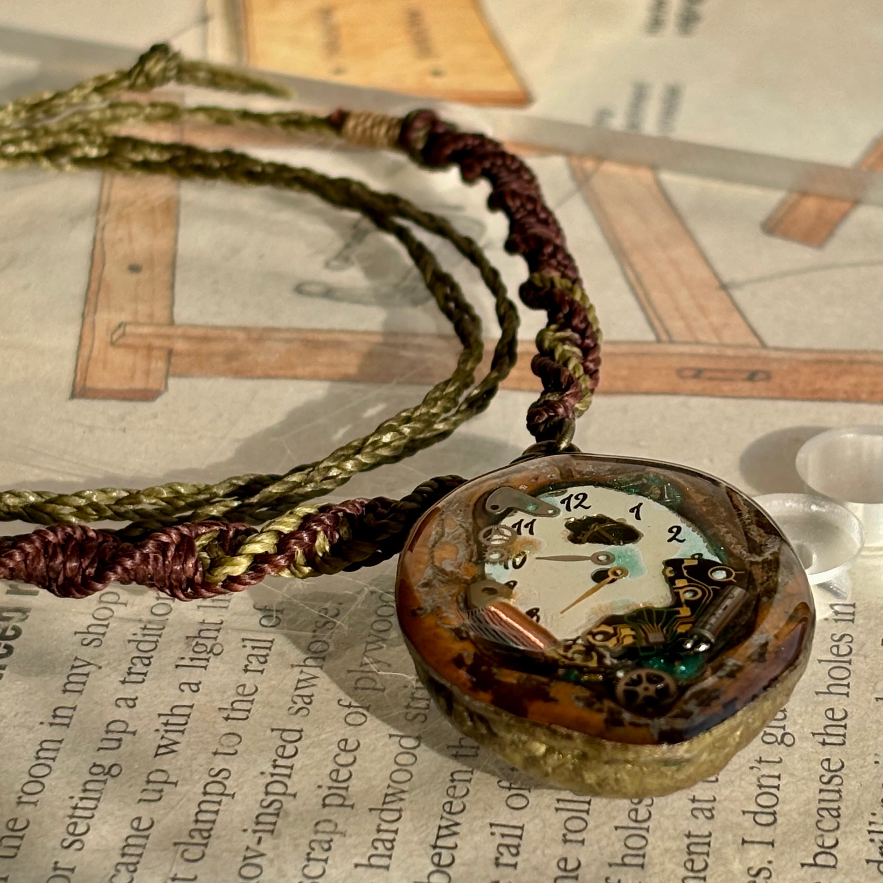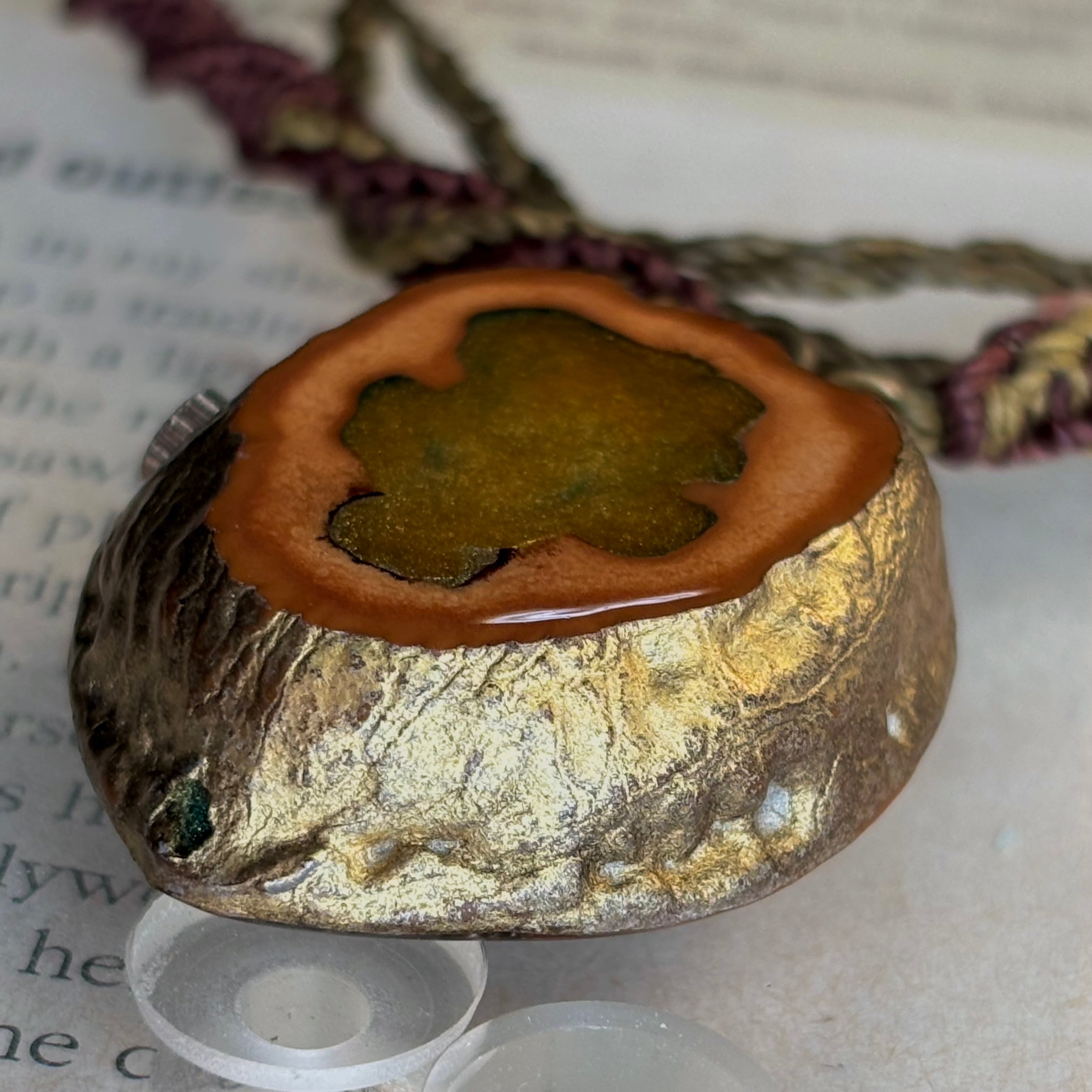 ジャンク品の腕時計をばらしてクルミの殻の中に封入しています。側面塗装はマッドゴールド。リューズを埋め込みました。所々パールパウダーで緑青(銅や真鍮のサビ)っぽく見せています。