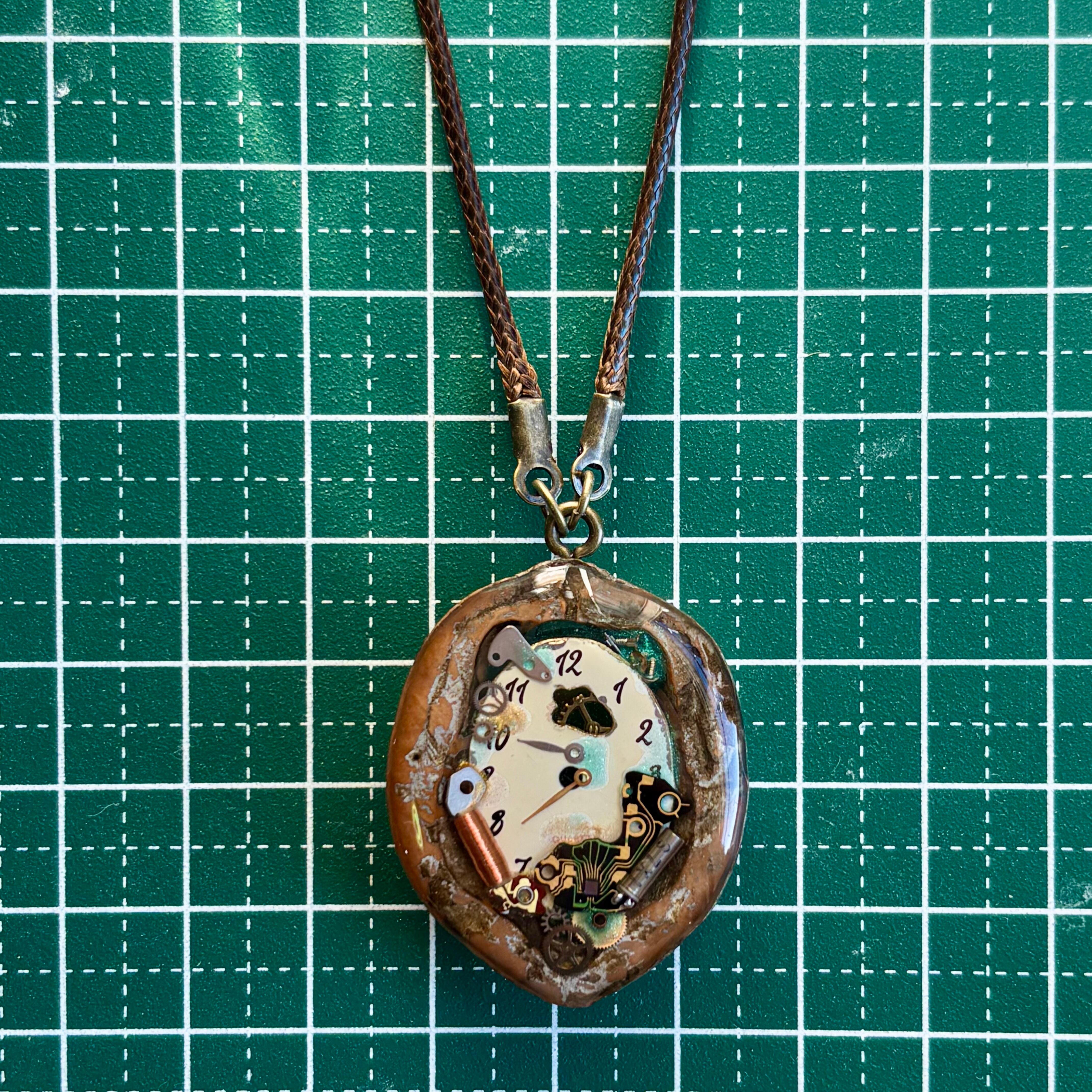 ジャンク品の腕時計をばらしてクルミの殻の中に封入しています。