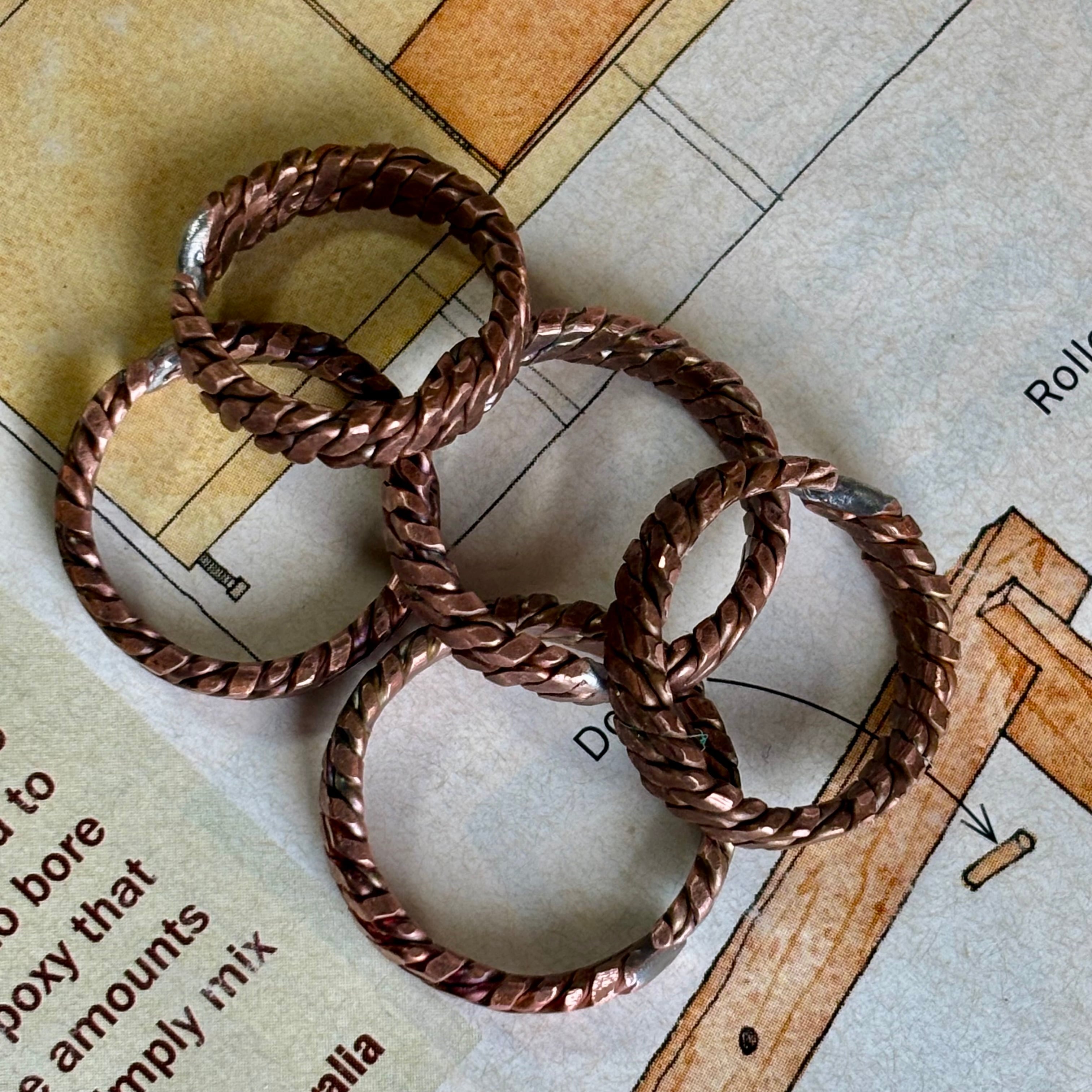 銅線を腕力で編み合わせてバーナーで焼いてトンカチで叩いてアンティーク風に仕上げたリングです。