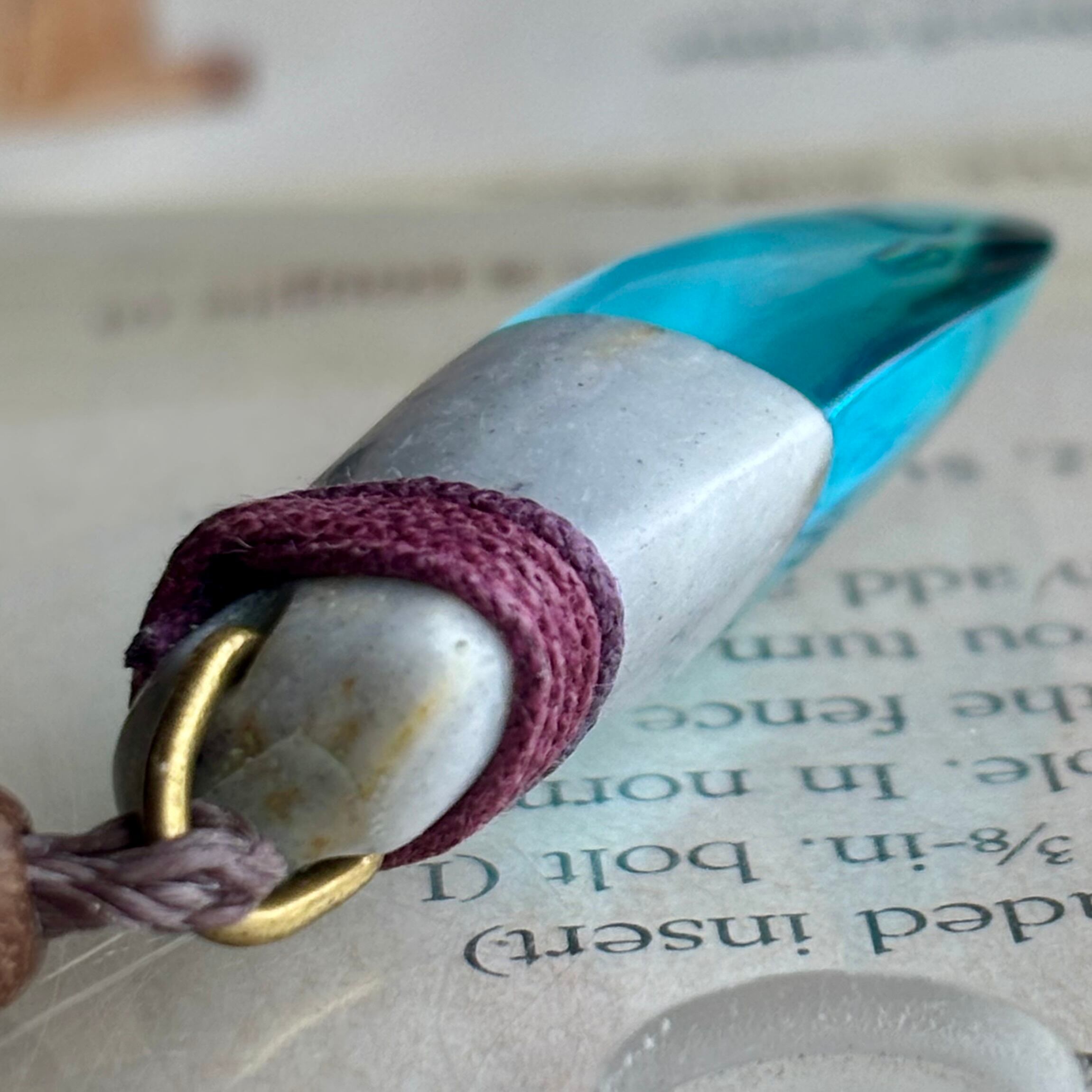 刃のレジンは青からちょっとだけ緑に変化しています。白い石の部分はかろうじてメノウか、大した模様もないので玉髄と言った方がいいかもしれません。