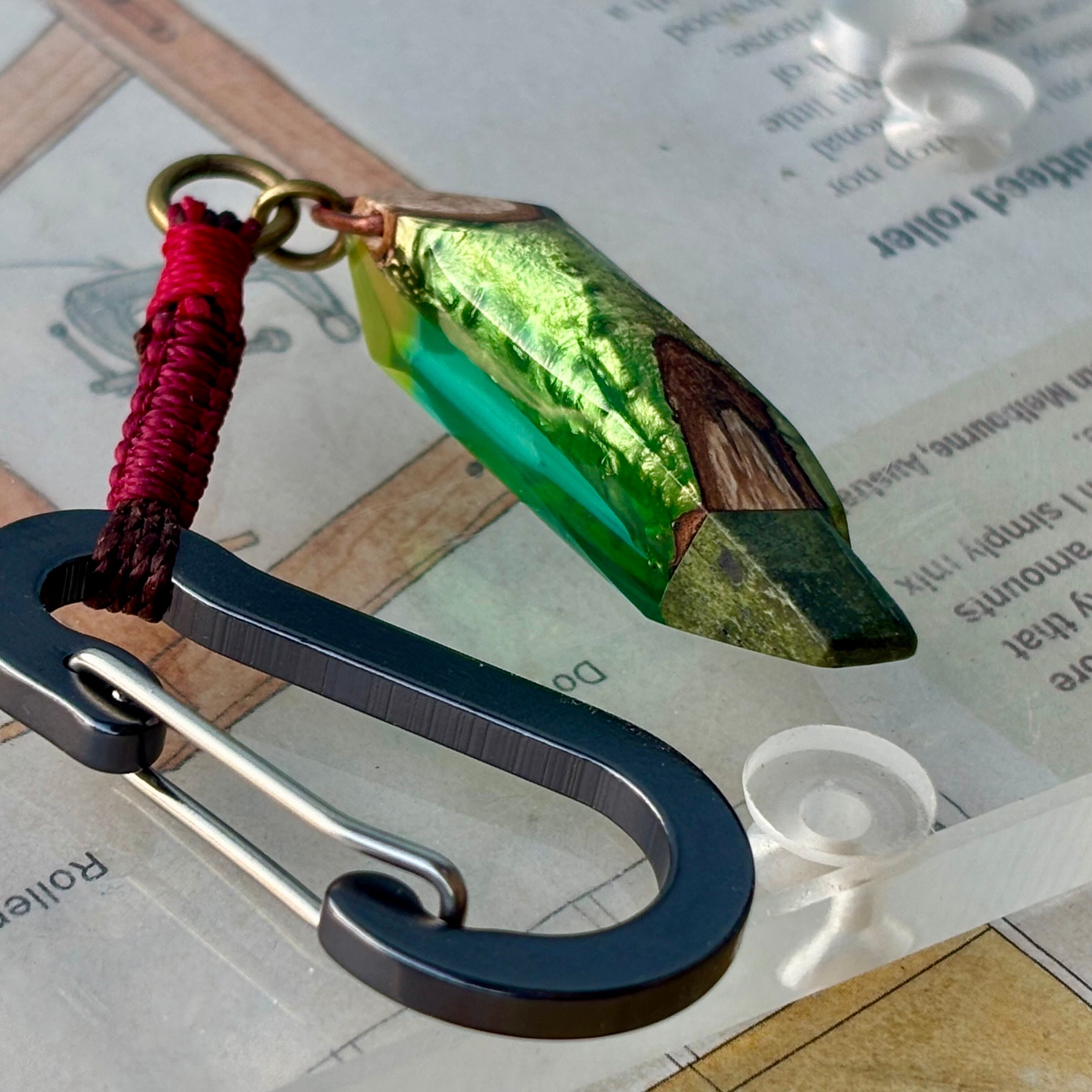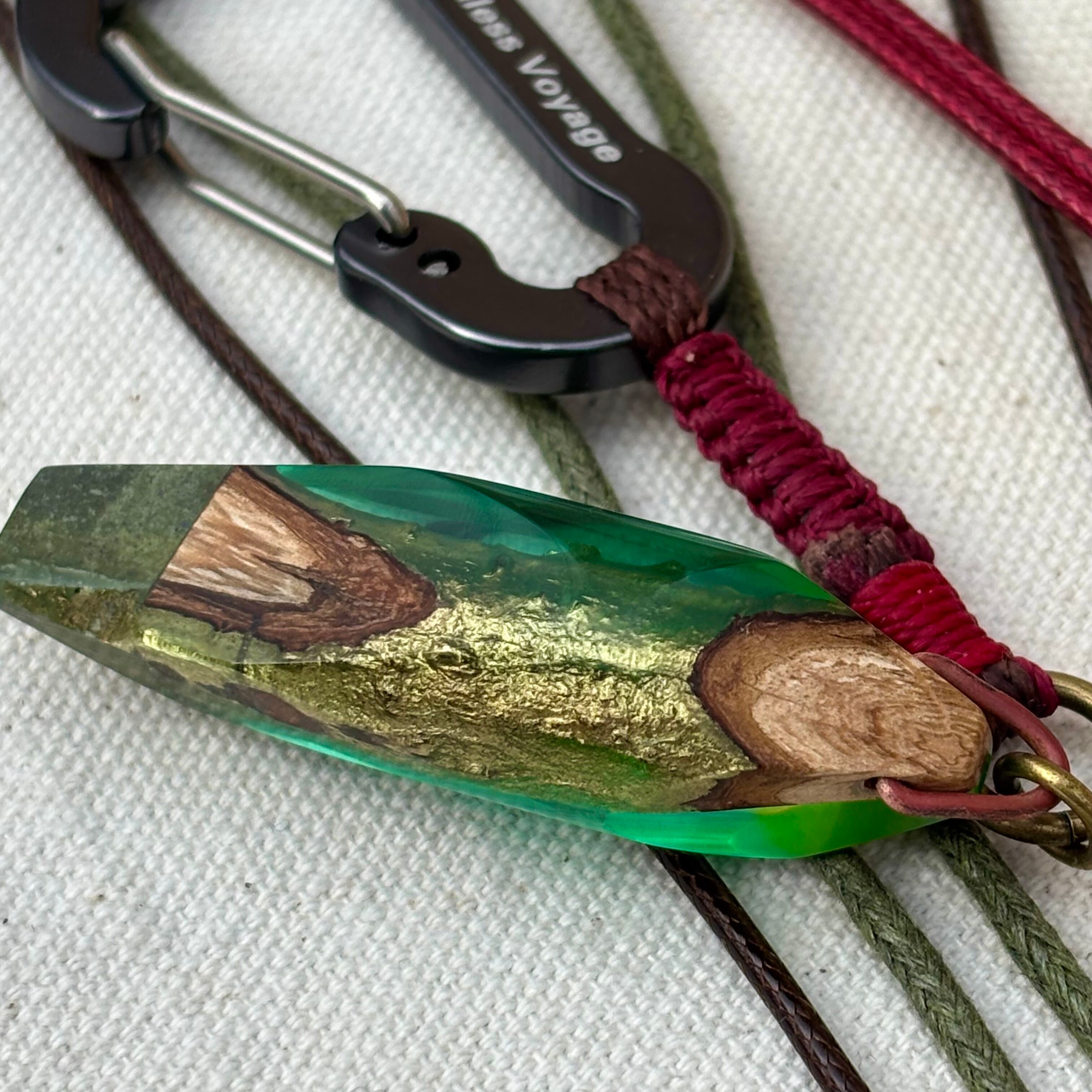 枝の端には蛇紋岩が接続しています。自作したAカンとカラビナとの間はワックスコードを編みました。