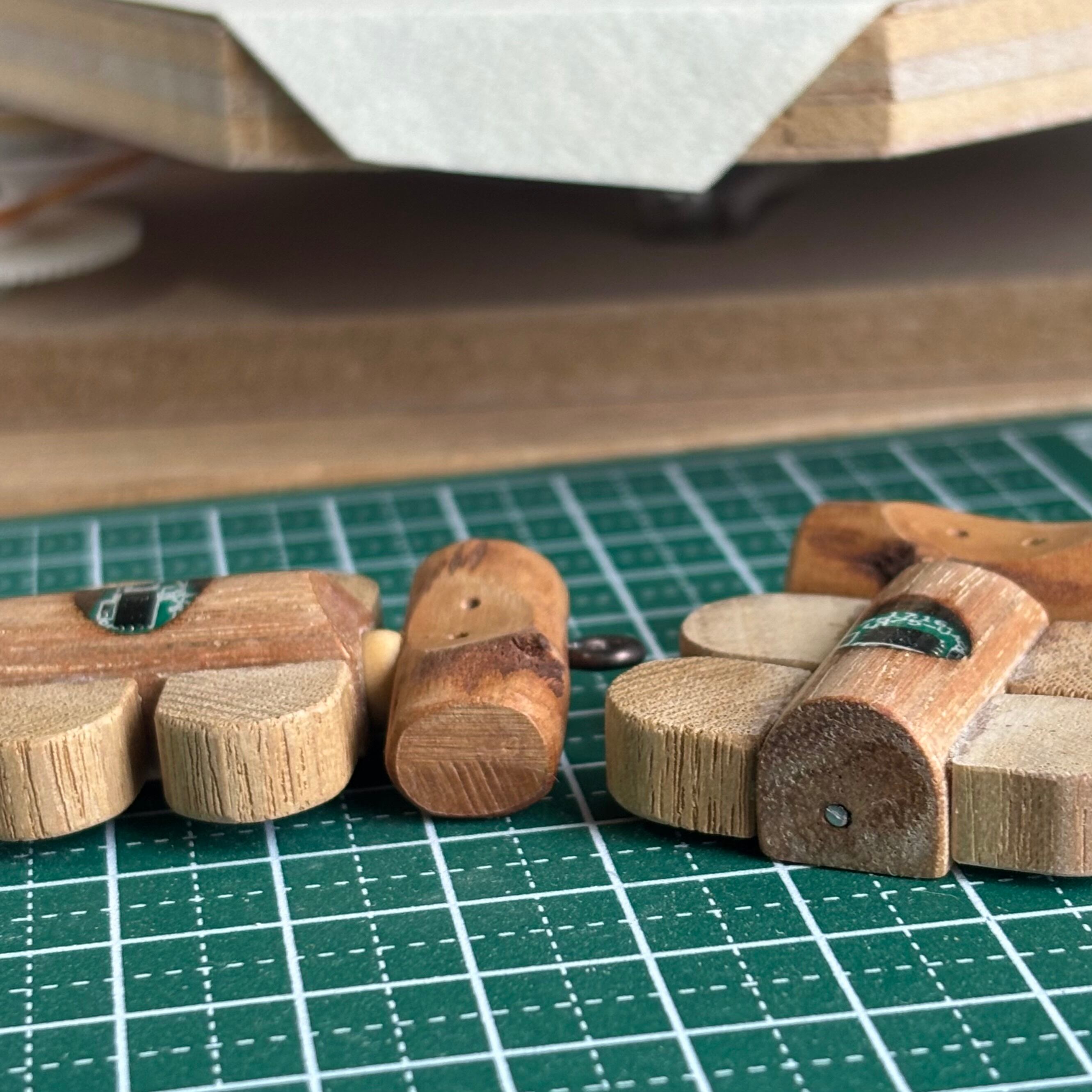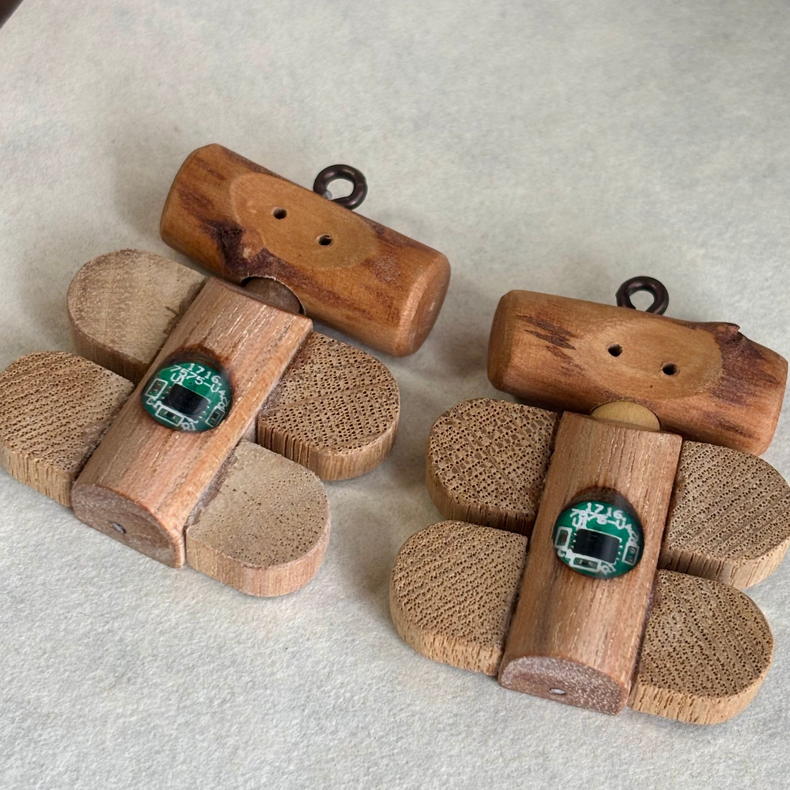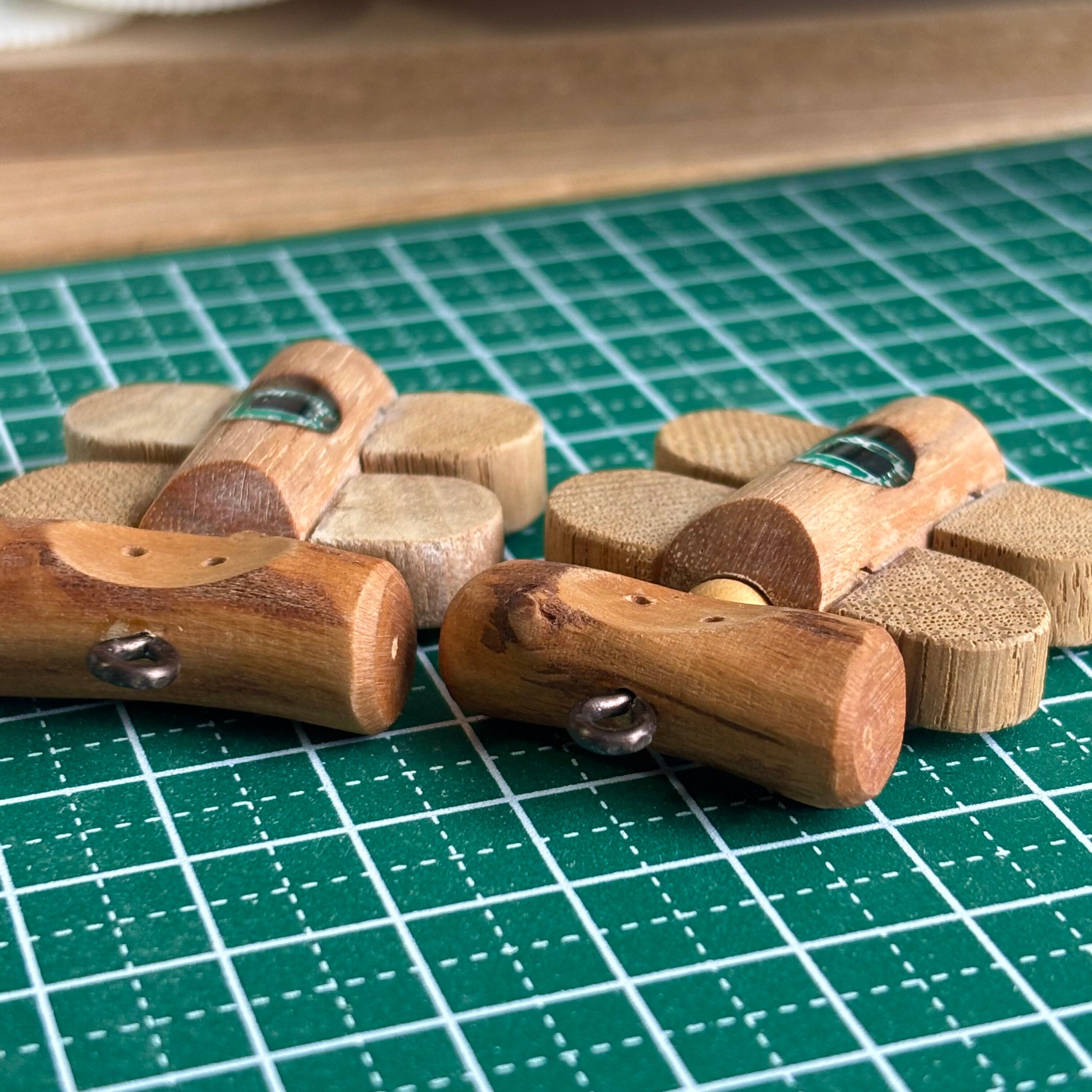 頭はミモザの枝です。もともとは昔作ったトグルボタンでした。なんとなく顔に見えたので、こういったものをいくつか作っていた時期がありました。
