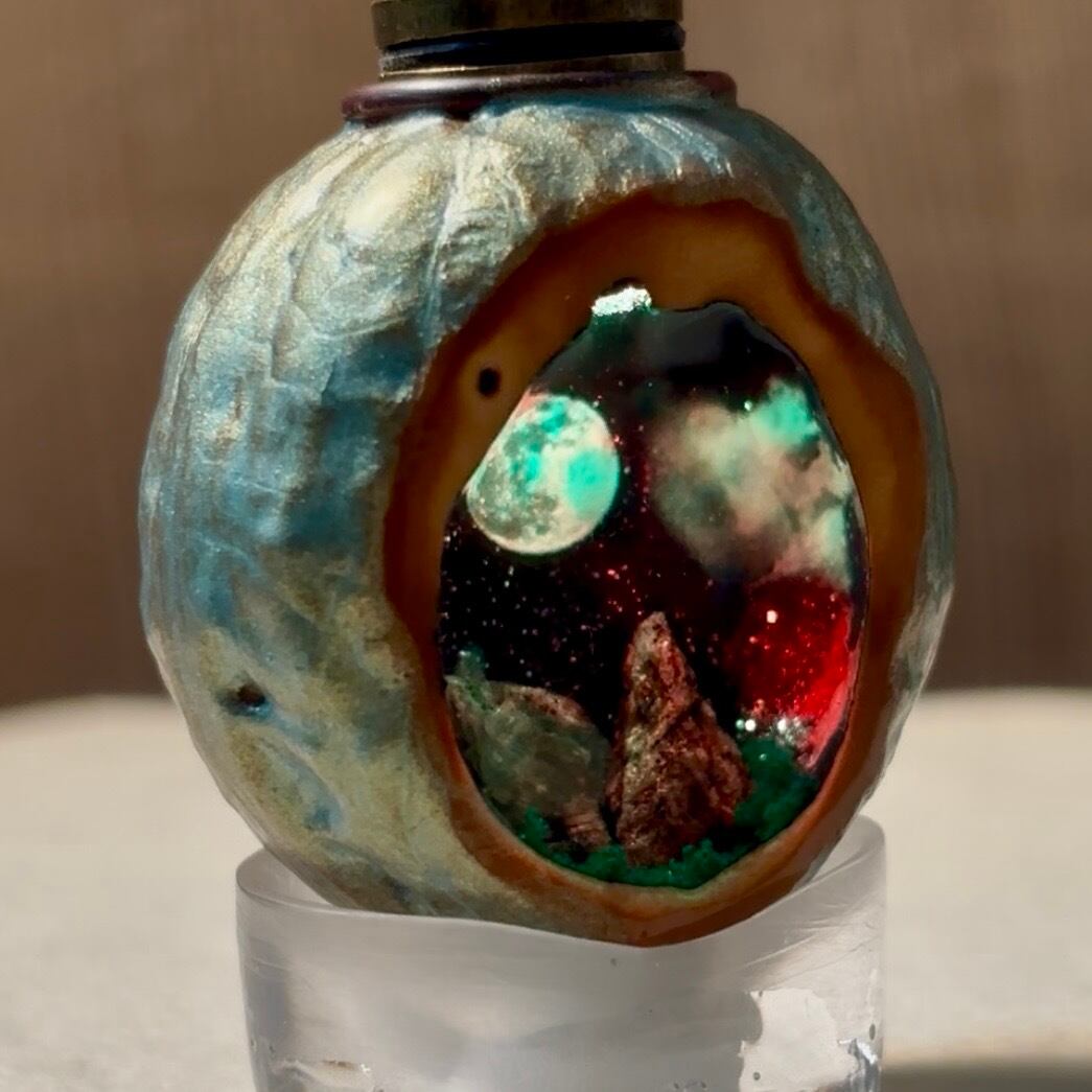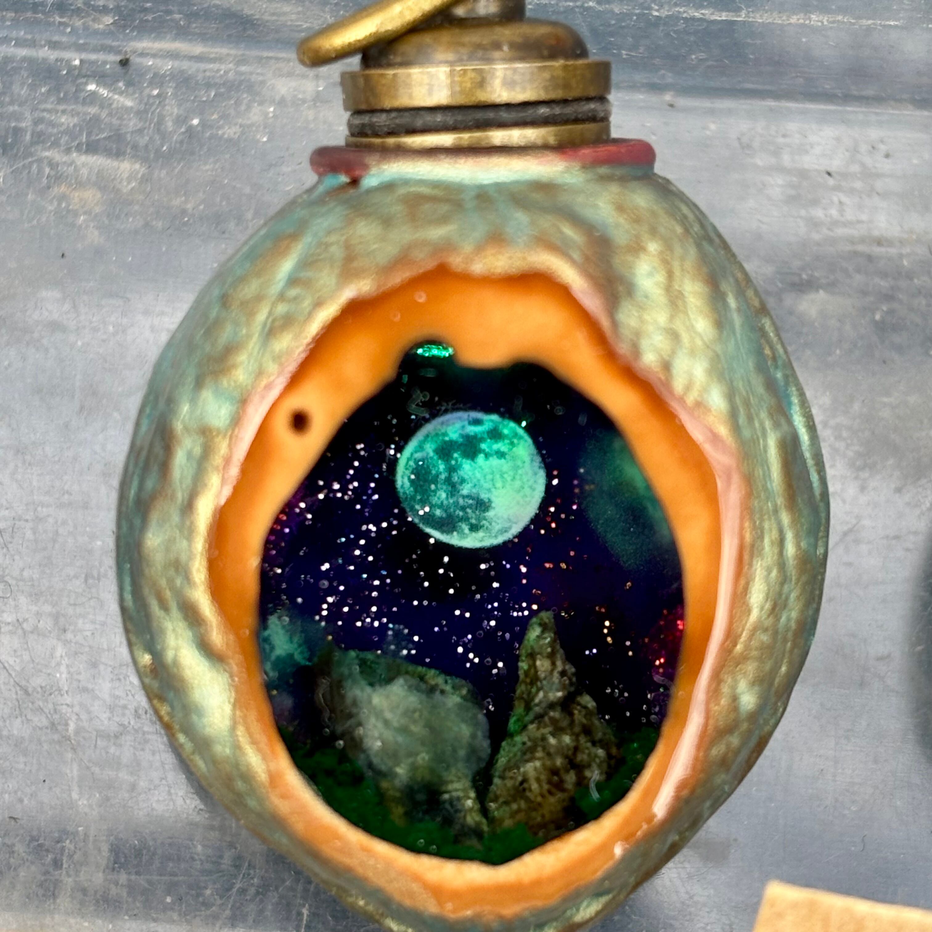 月と岩山のイメージです。胡桃の内壁を宇宙っぽく仕上げました。クルミの殻はパールパウダーで薄く彩色しています。