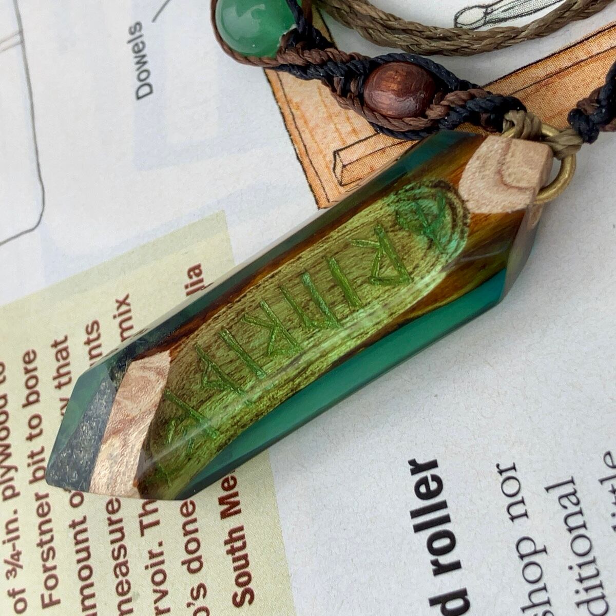 木と石とレジンを組み合わせたネックレスです。