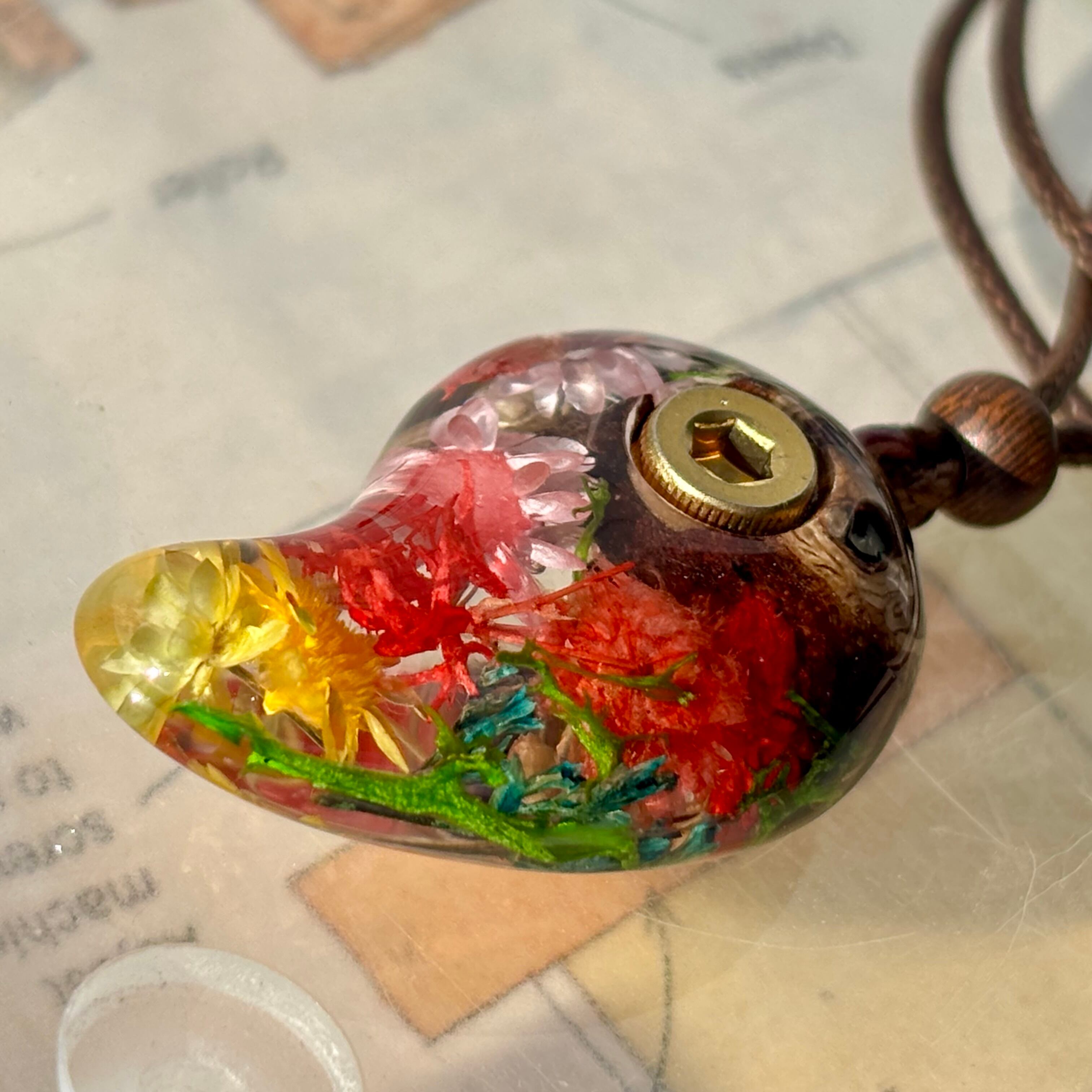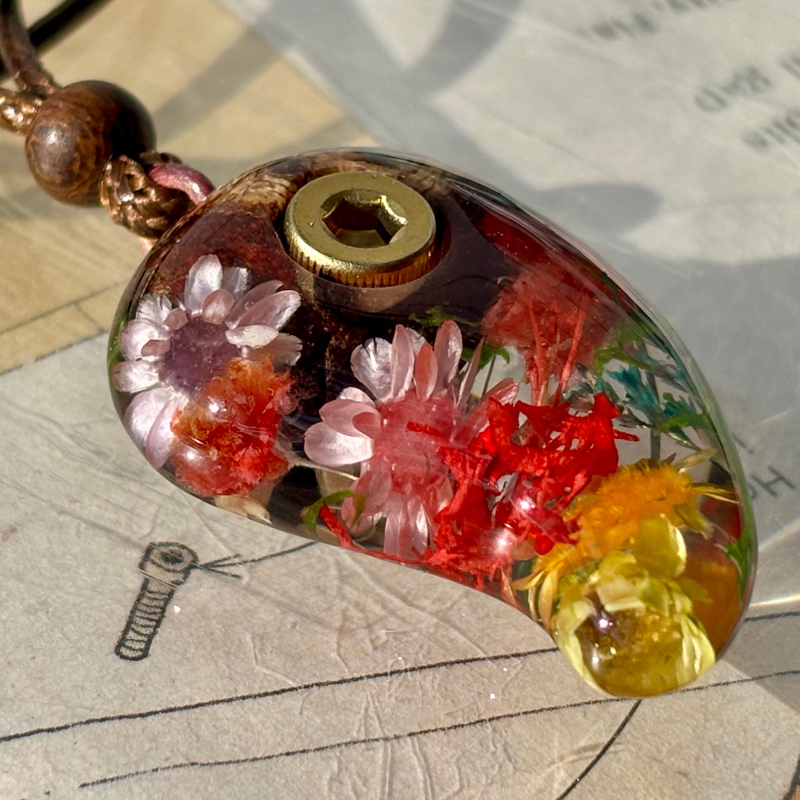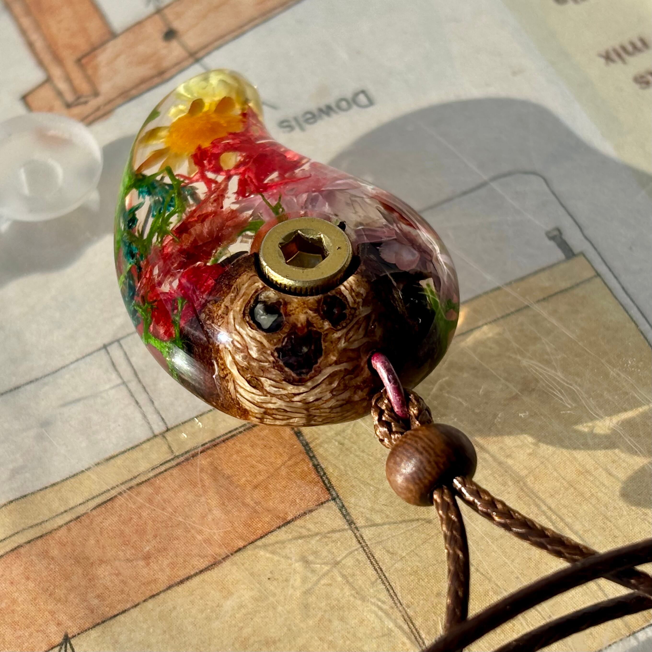 頭頂部にユーカリの実。そこから下へ何種類かのドライフラワー。向日葵みたいなのはスターフラワーと呼ばれていて、縁日のカラーヒヨコみたいに様々な色に染められたものが世に存在しています。