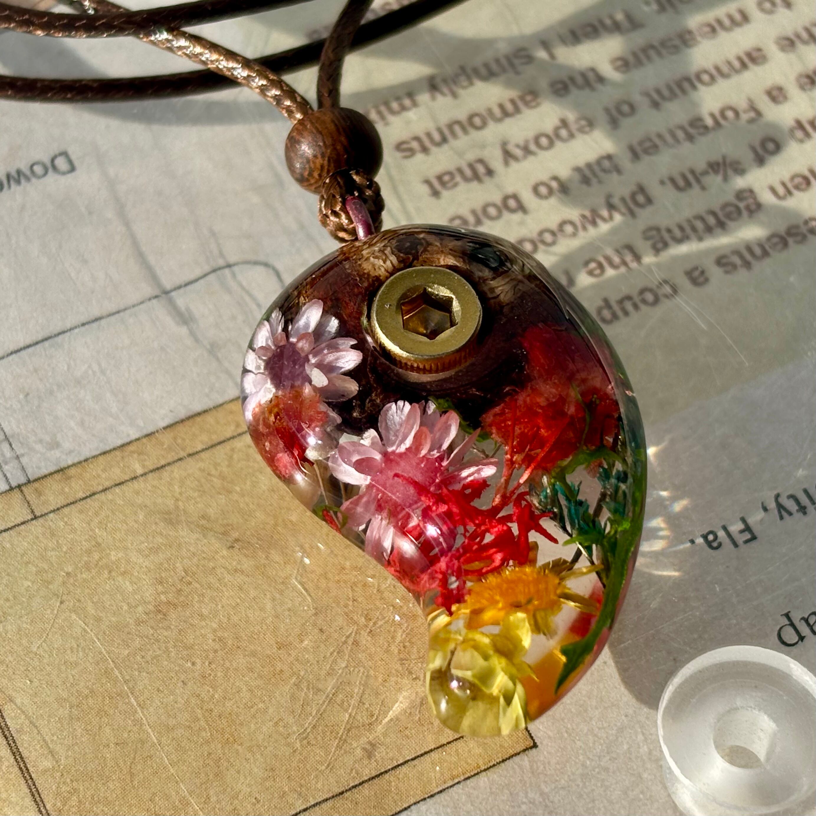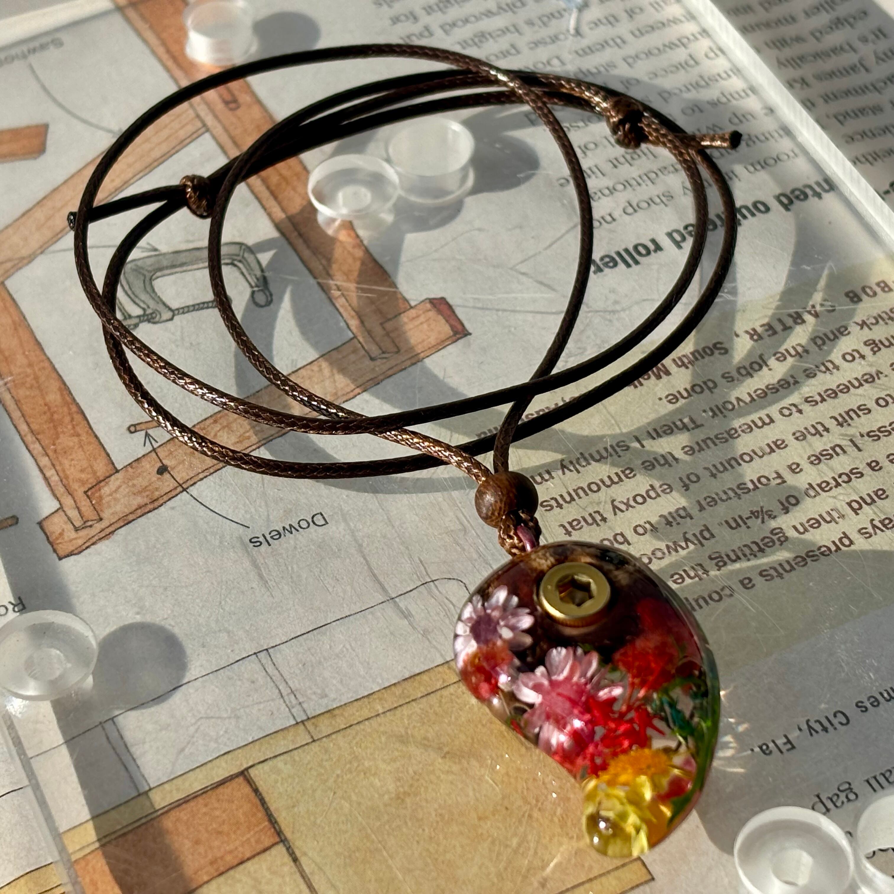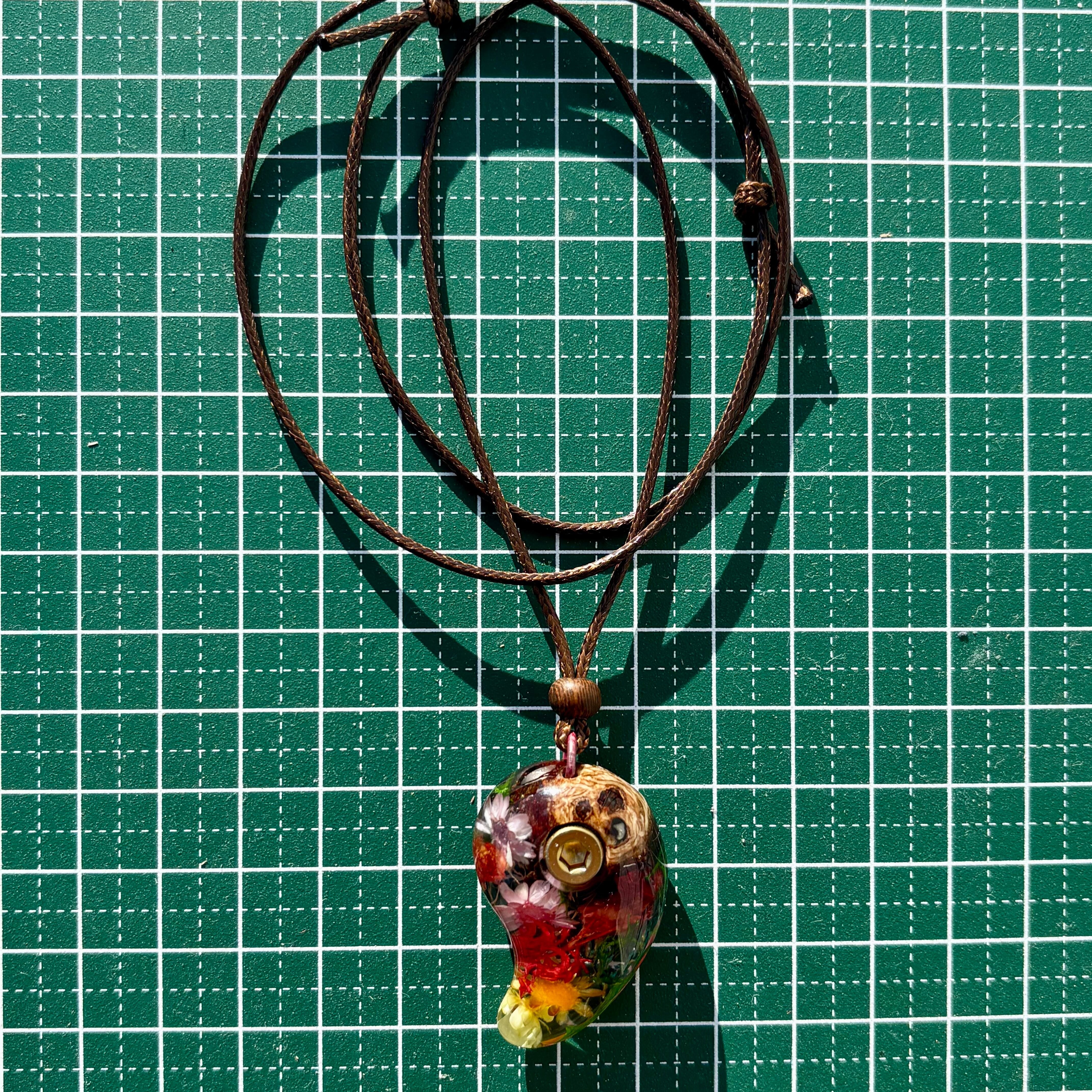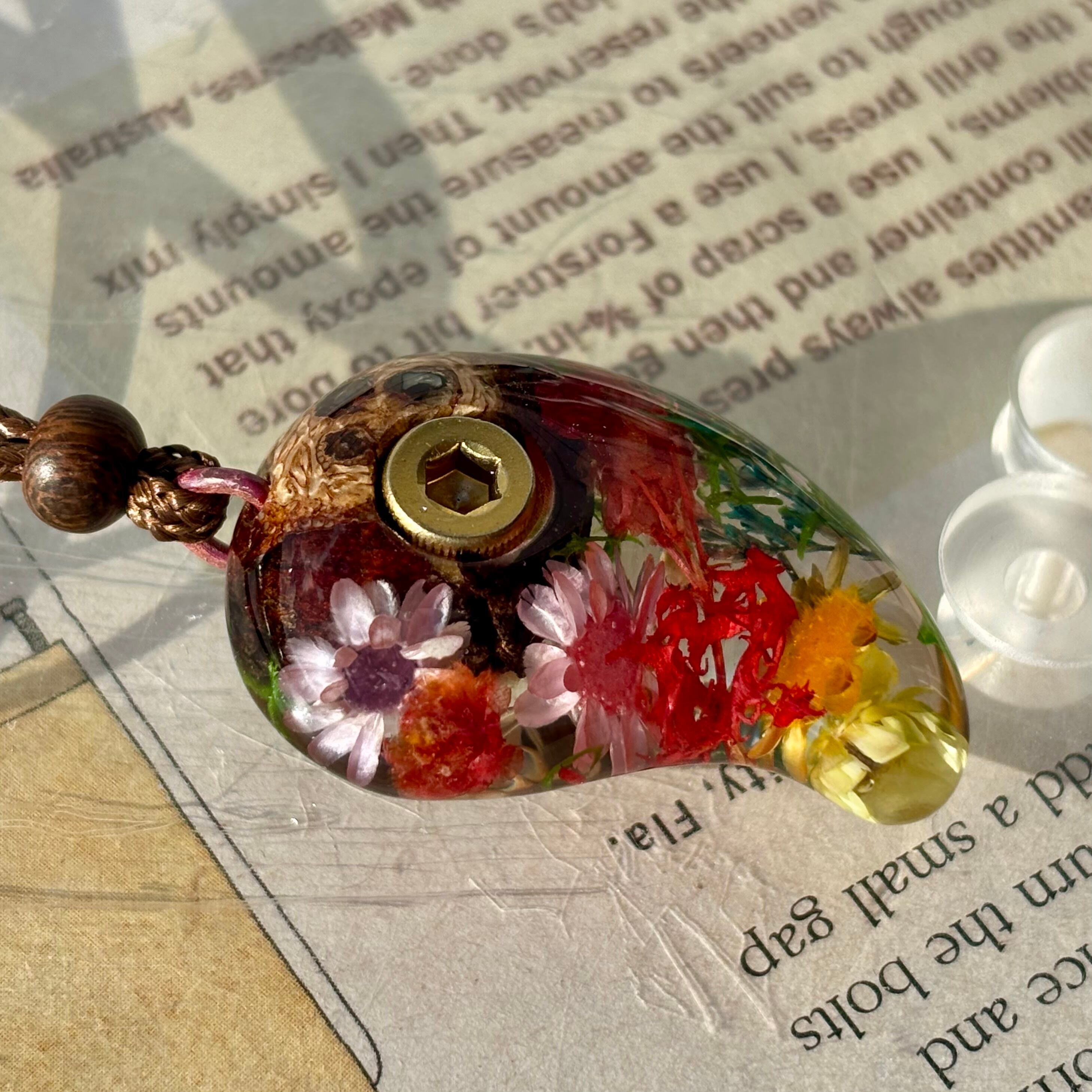 頭頂部にユーカリの実。そこから下へ何種類かのドライフラワー。向日葵みたいなのはスターフラワーと呼ばれていて、縁日のカラーヒヨコみたいに様々な色に染められたものが世に存在しています。