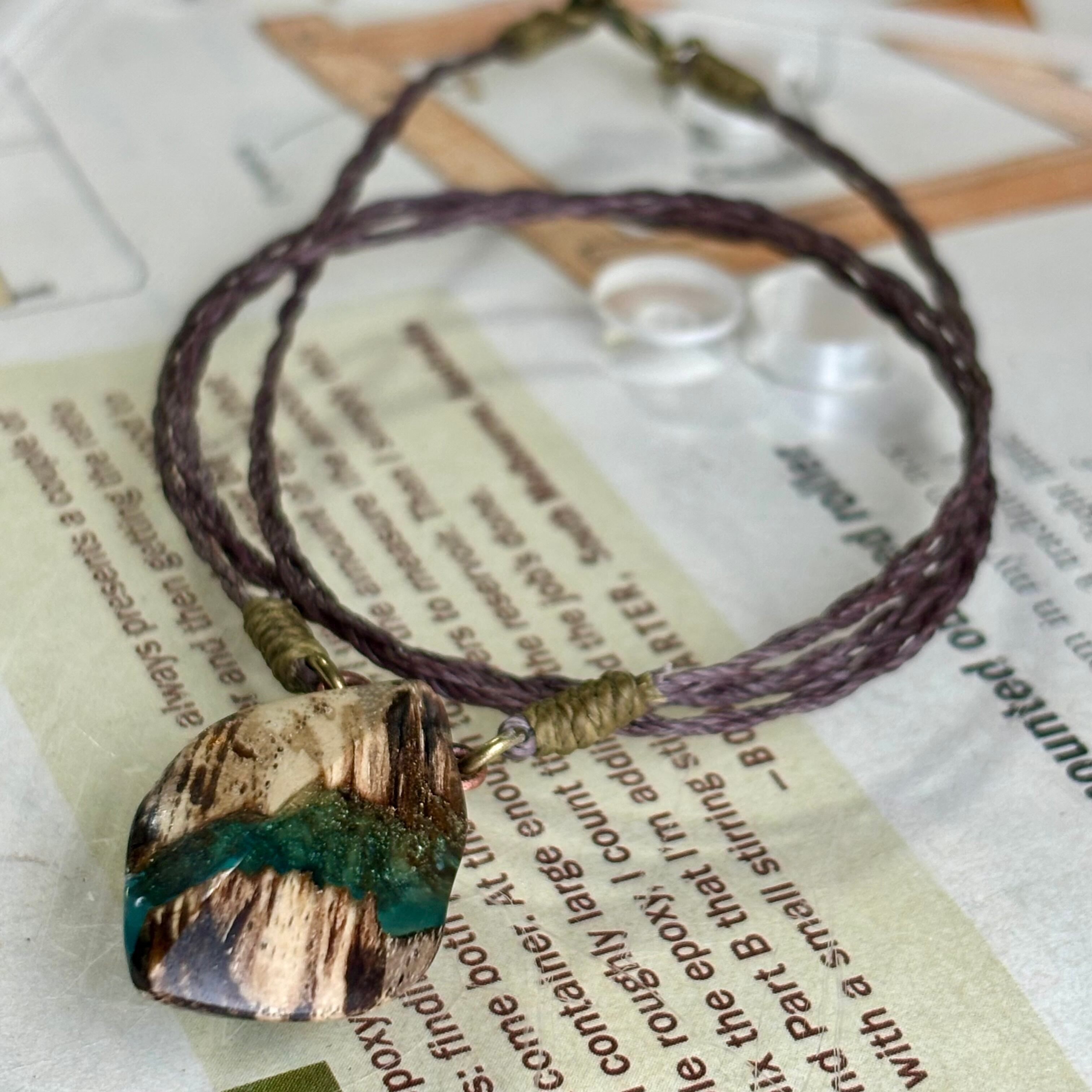 コードはマクラメコードを編んでいます。長さは約55センチメートル。首の後ろで、カニカンで留めます。