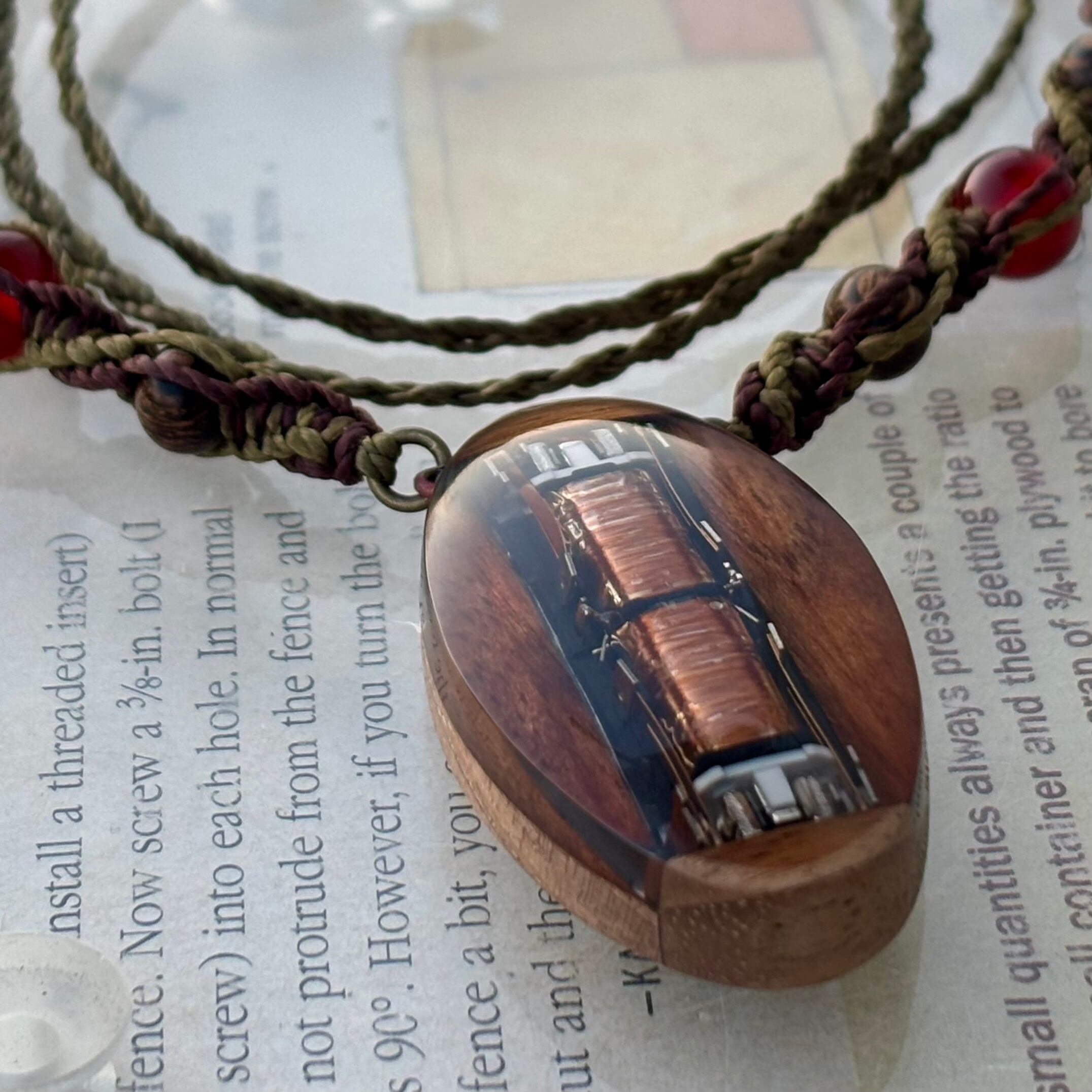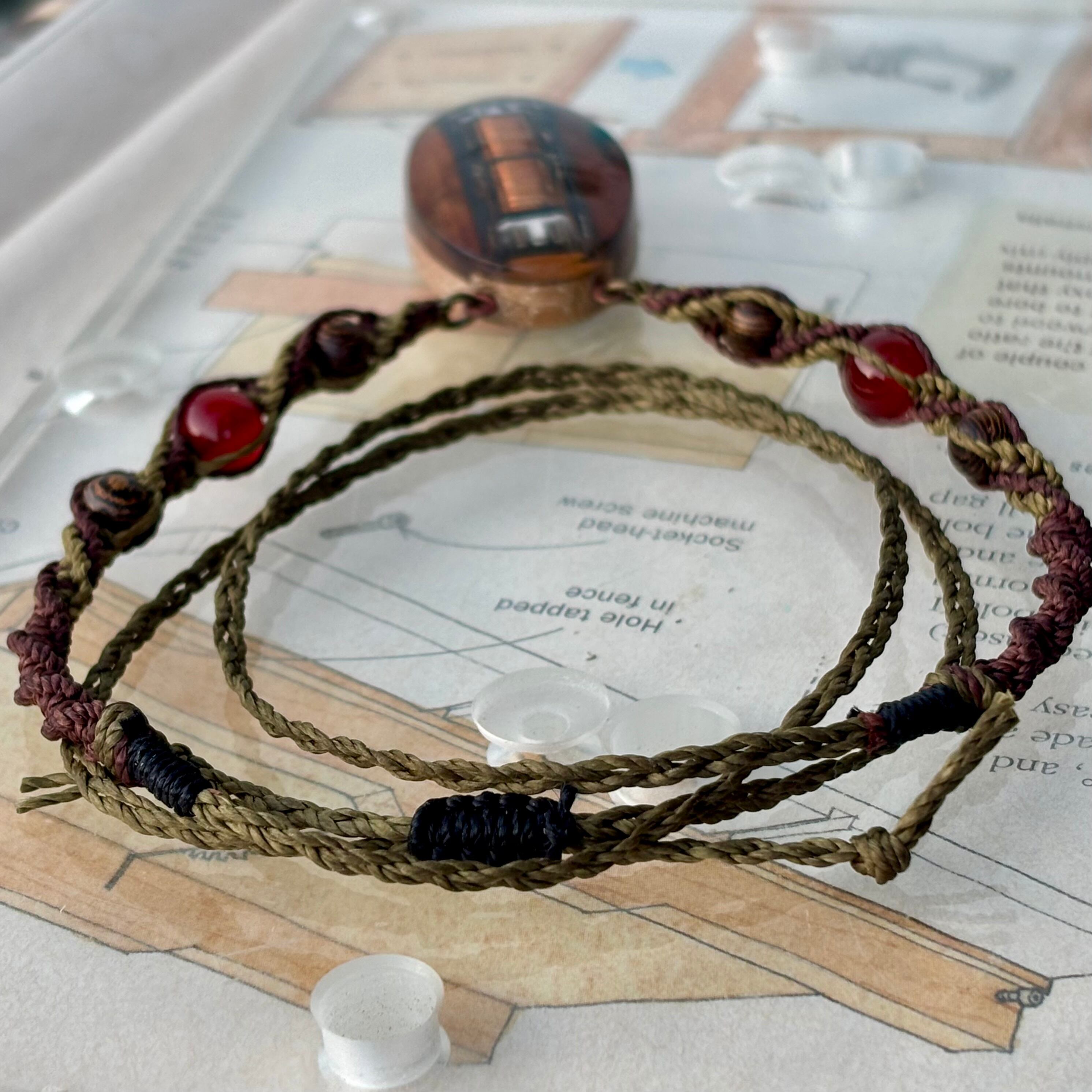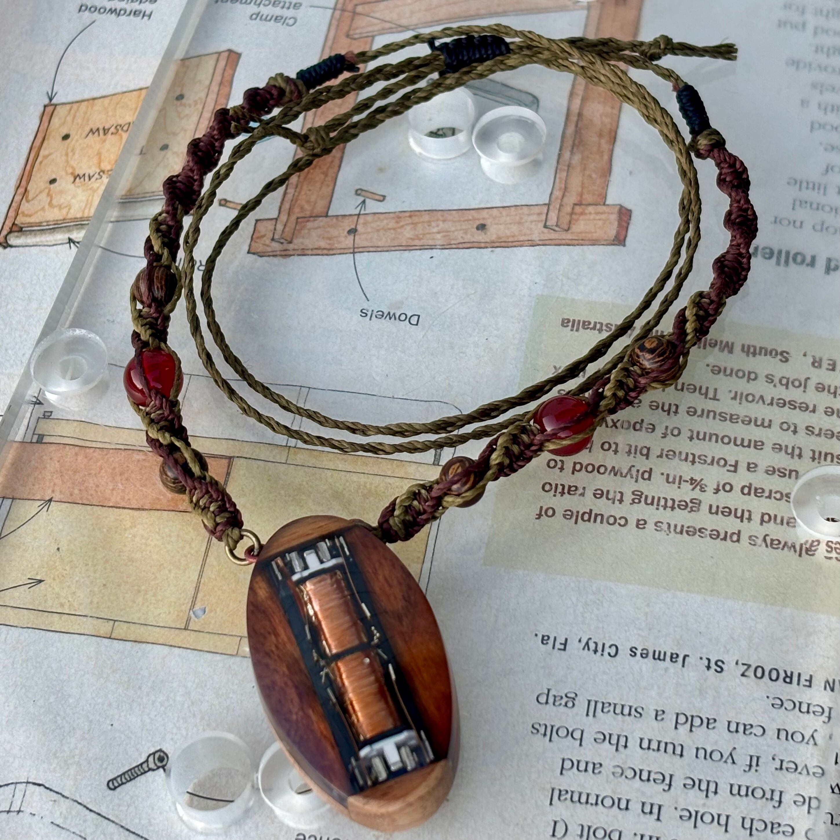 紐はワックスコードを編んでいて、最大長さは70センチメートル強。途中に編み込んであるのはカーネリアンと木球です。長さは調節が出来ます。